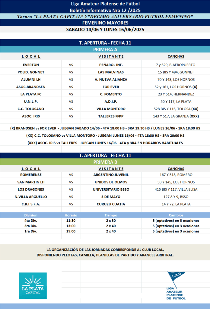 #Femenino T.APERTURA 2025 – Primera A ┃ Primera B Fecha 11 – MAYORES