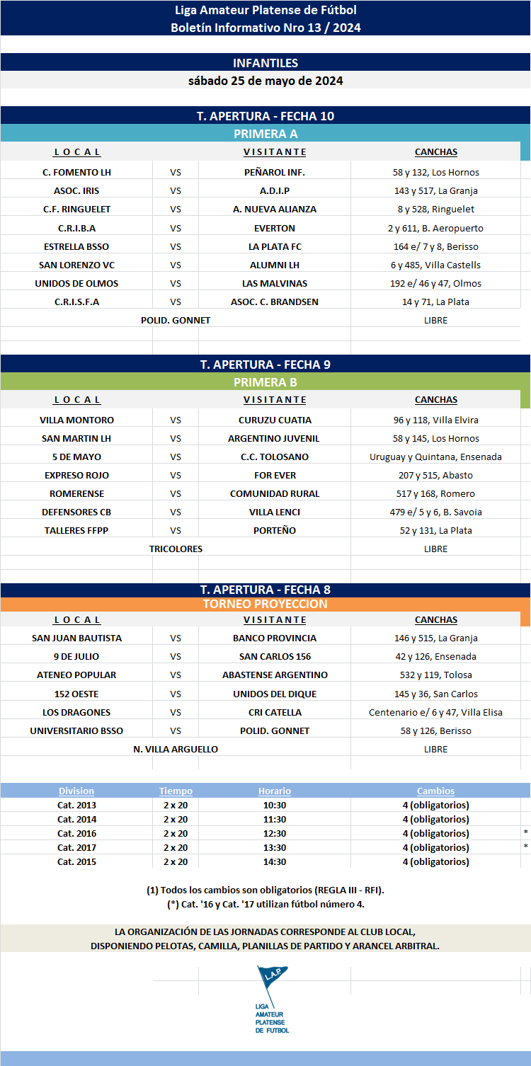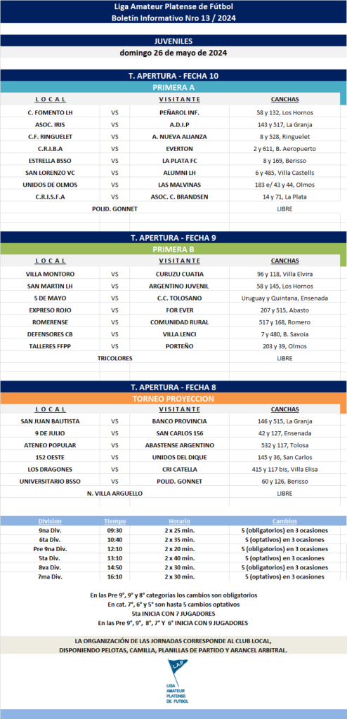 Les compartimos el boletín informativo con la programación Nro°13 a disputarse el próximo fin de semana según el siguiente cronograma: