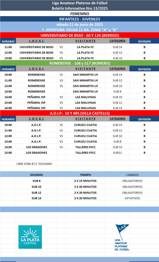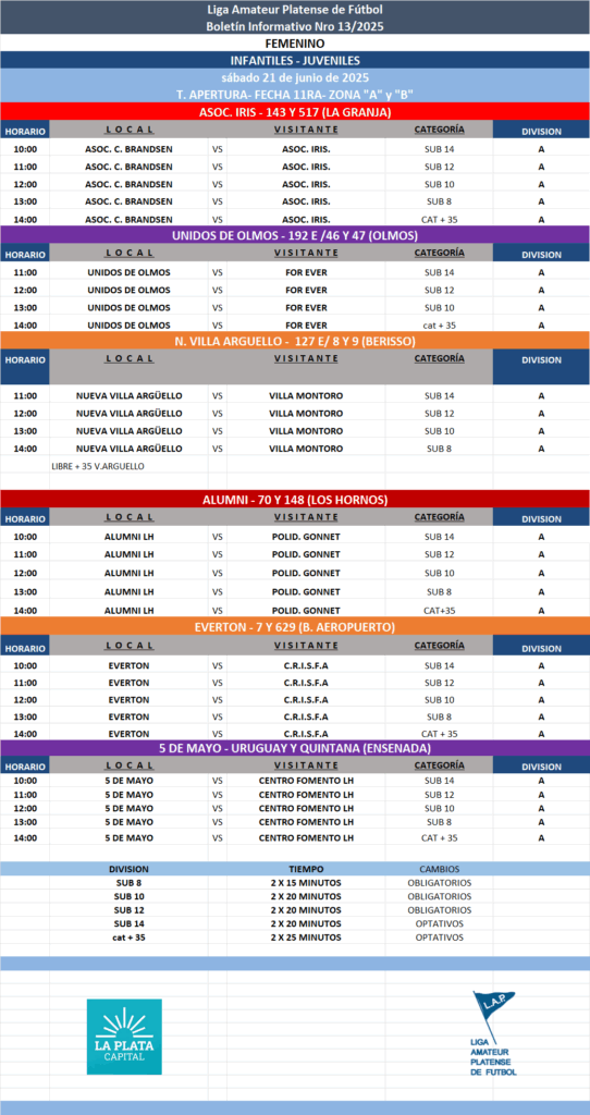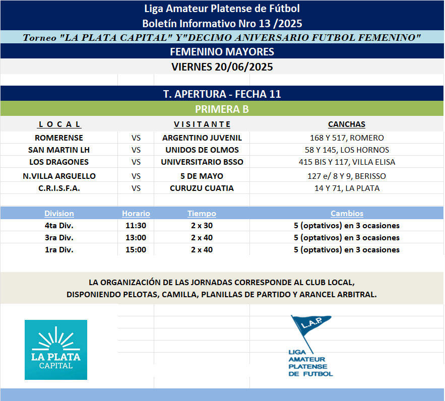 Les comunicamos el boletín informativo con la programación N°13 a disputarse los próximos viernes, sábado y domingo según el siguiente cronograma: