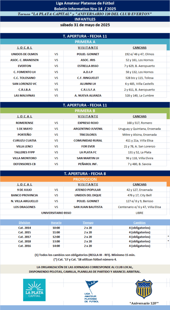 PROGRAMACIÓN NRO 14 – 2025: T. APERTURA LA PLATA CAPITAL – ANIVERSARIO 120 CLUB EVERTON