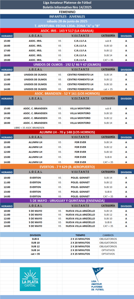 #Femenino T.APERTURA 2025 – Primera A ┃ Primera B Fecha 12 -INFANTO-JUVENILES Y SENIOR +35