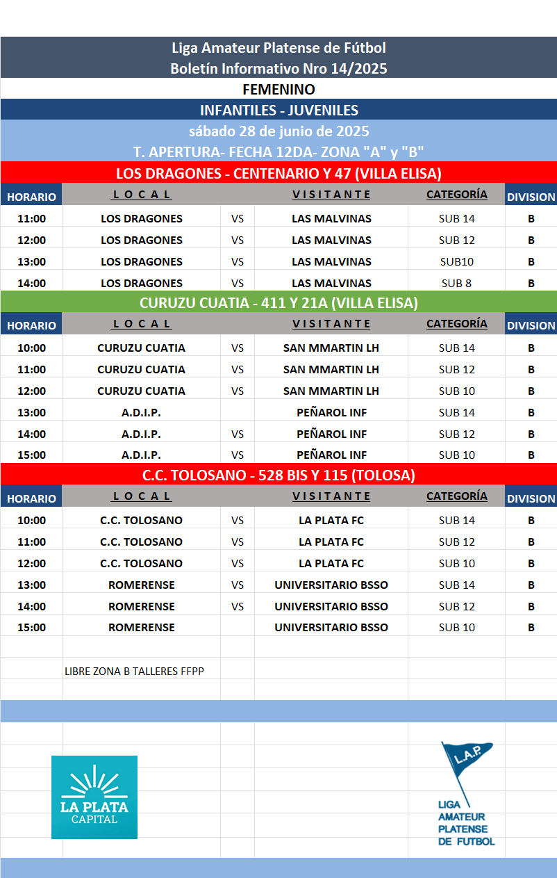 Les comunicamos el boletín informativo con la programación N°14 a disputarse el próximo fin de semana según el siguiente cronograma: