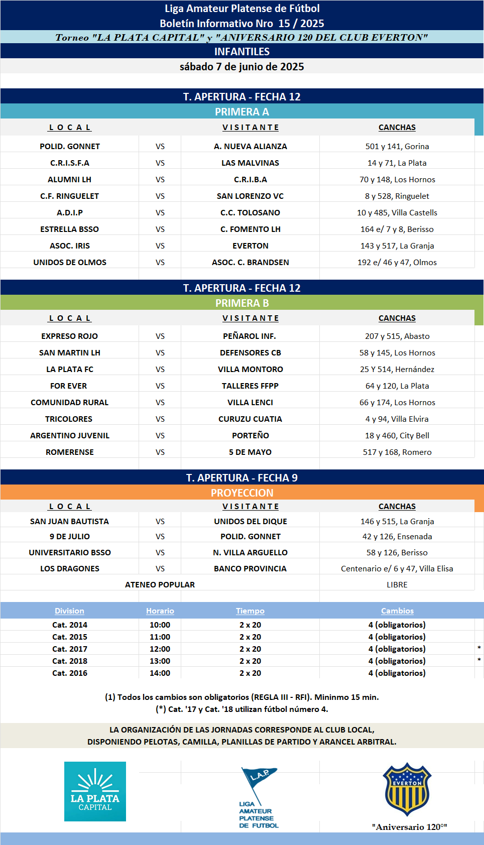 #Masculino T. APERTURA LA PLATA CAPITAL – ANIVERSARIO 120 CLUB EVERTON – Primera A | Primera B: FECHA 12 | T.Proyección – FECHA 9 MAYORES E INFANTILES