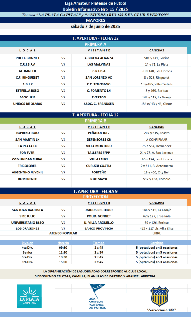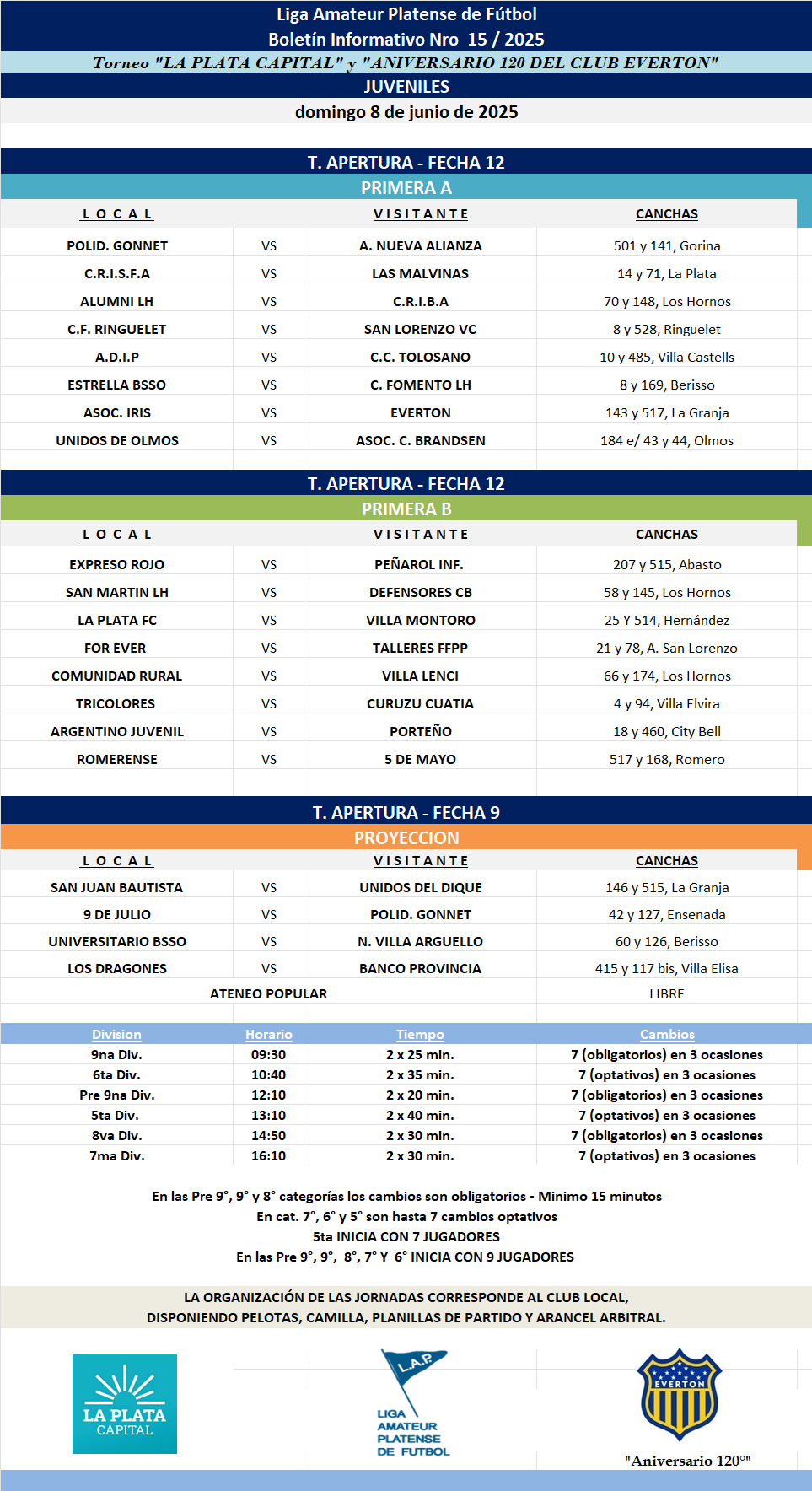 #Masculino T. APERTURA LA PLATA CAPITAL – ANIVERSARIO 120 CLUB EVERTON – Primera A | Primera B FECHA 12 | T.Proyección – FECHA 9 JUVENILES