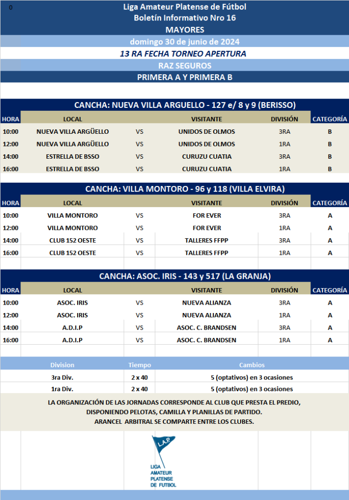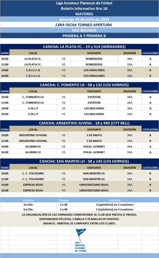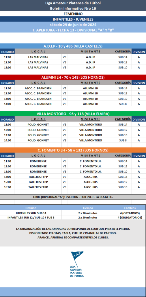 Les comunicamos el boletín informativo con la programación N°16 a disputarse el próximo fin de semana según el siguiente cronograma: