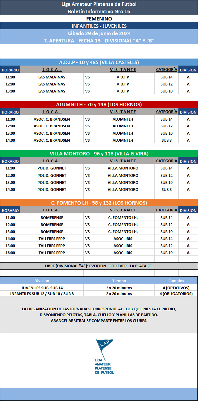 Les comunicamos el boletín informativo con la programación N°16 a disputarse el próximo fin de semana según el siguiente cronograma: