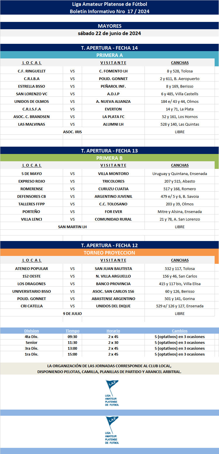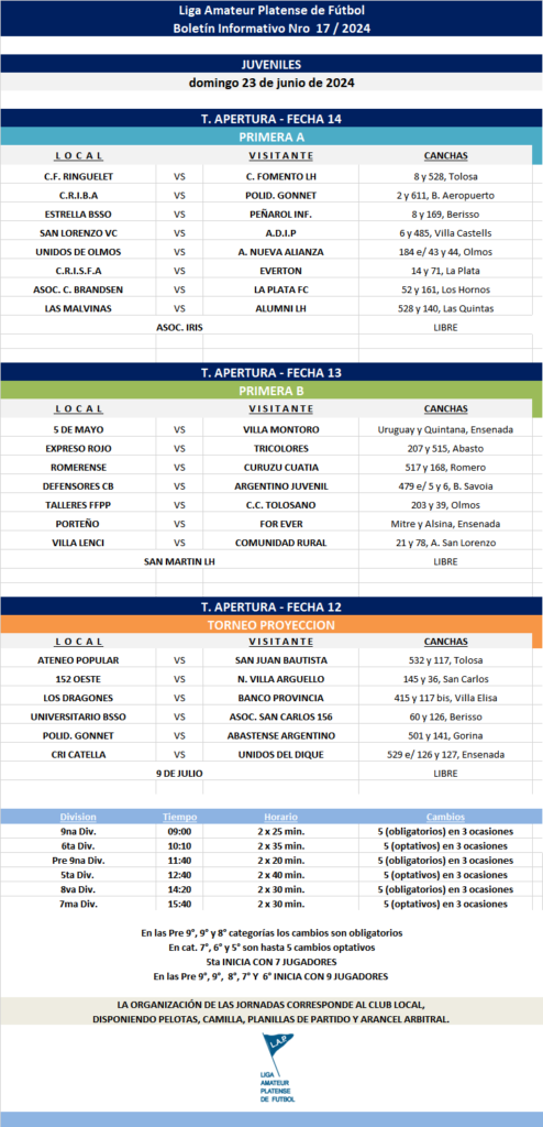 Les compartimos el boletín informativo con la programación Nro°17 a disputarse el próximo fin de semana según el siguiente cronograma: