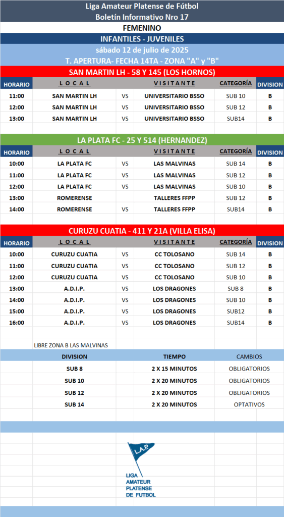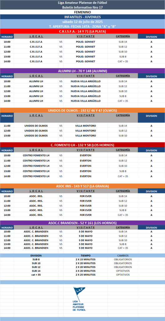 #Femenino T.APERTURA 2025 – Zona A Fecha 14 ┃ Zona B Fecha 14 – INFANTOJUVENILES