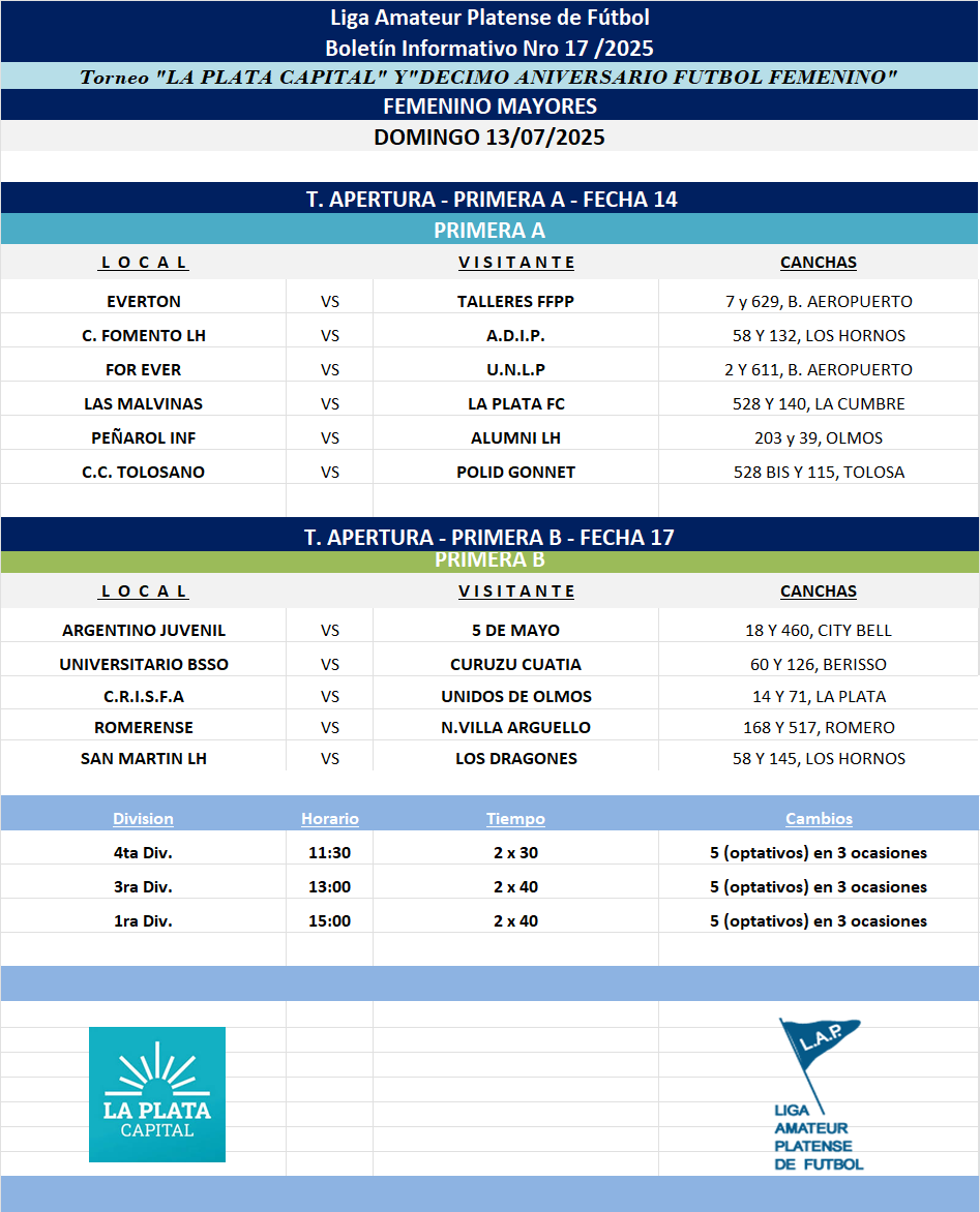 #Femenino T.APERTURA 2025 – Primera A Fecha 14 ┃ Primera B Fecha 17 – MAYORES
