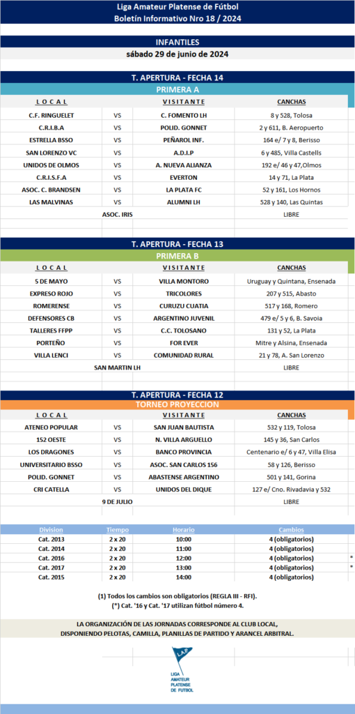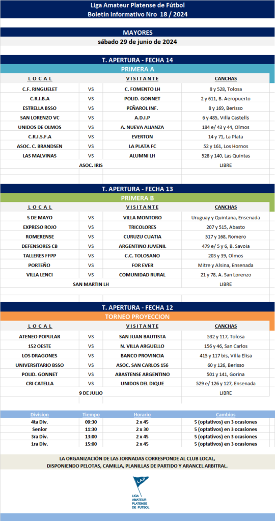 Les compartimos el boletín informativo con la programación Nro°18 a disputarse el próximo fin de semana según el siguiente cronograma:
