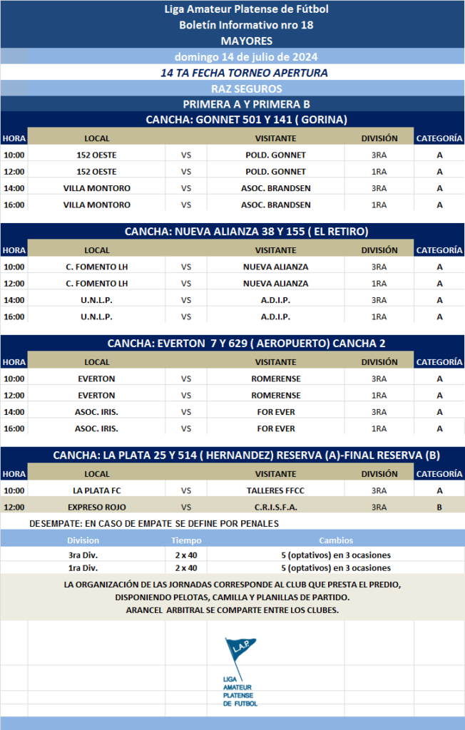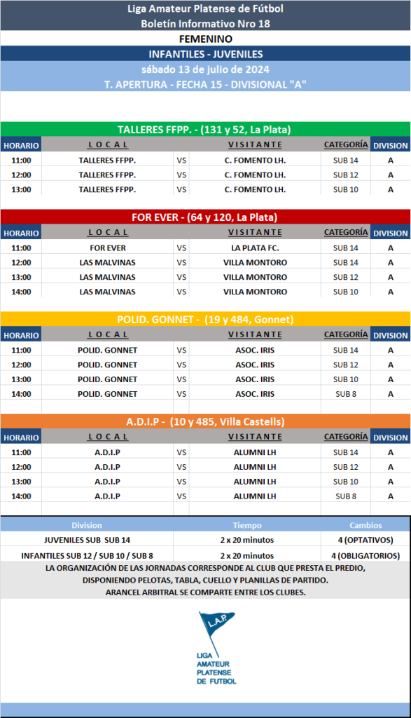 Les comunicamos el boletín informativo con la programación N°18 a disputarse el próximo fin de semana según el siguiente cronograma: