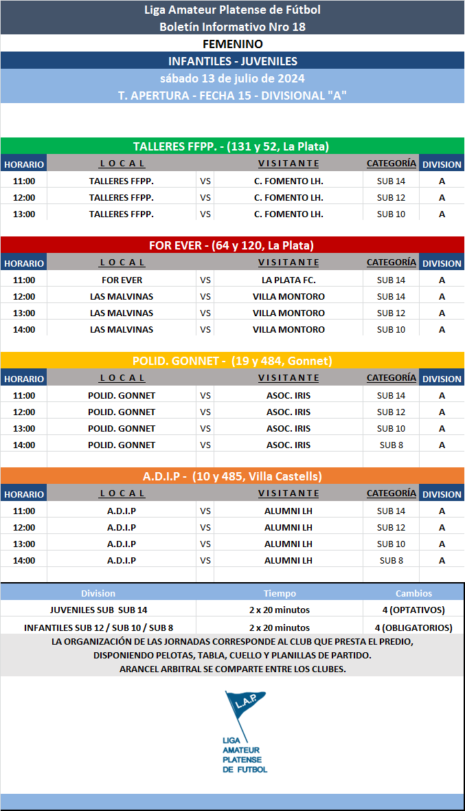 Les comunicamos el boletín informativo con la programación N°18 a disputarse el próximo fin de semana según el siguiente cronograma: