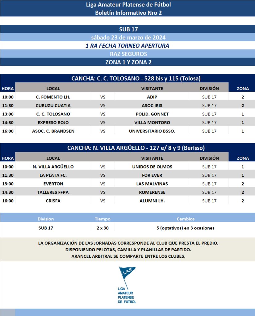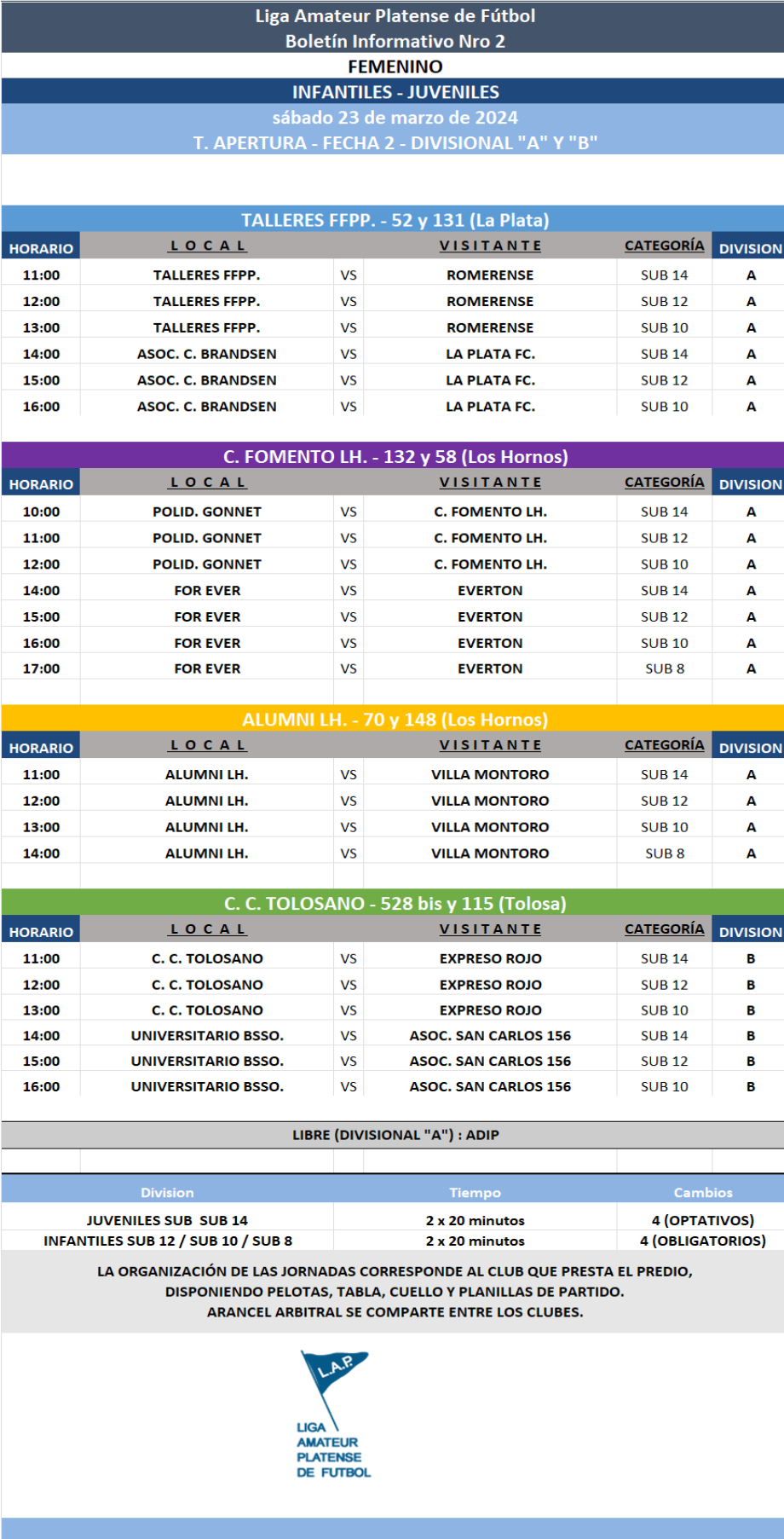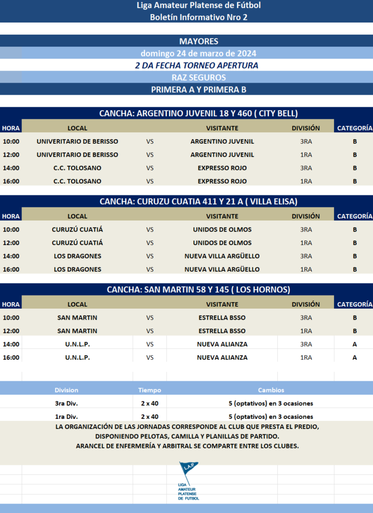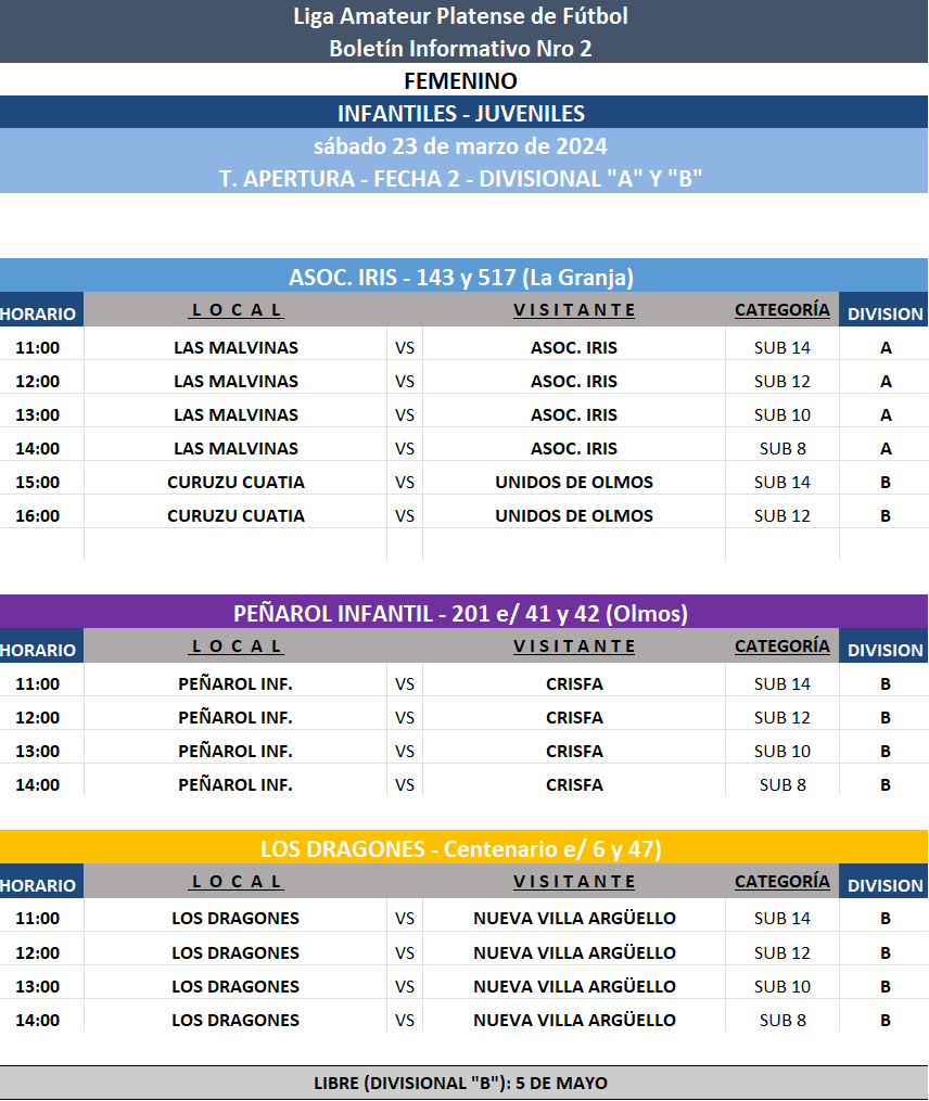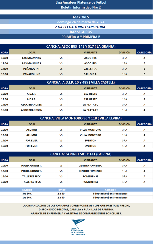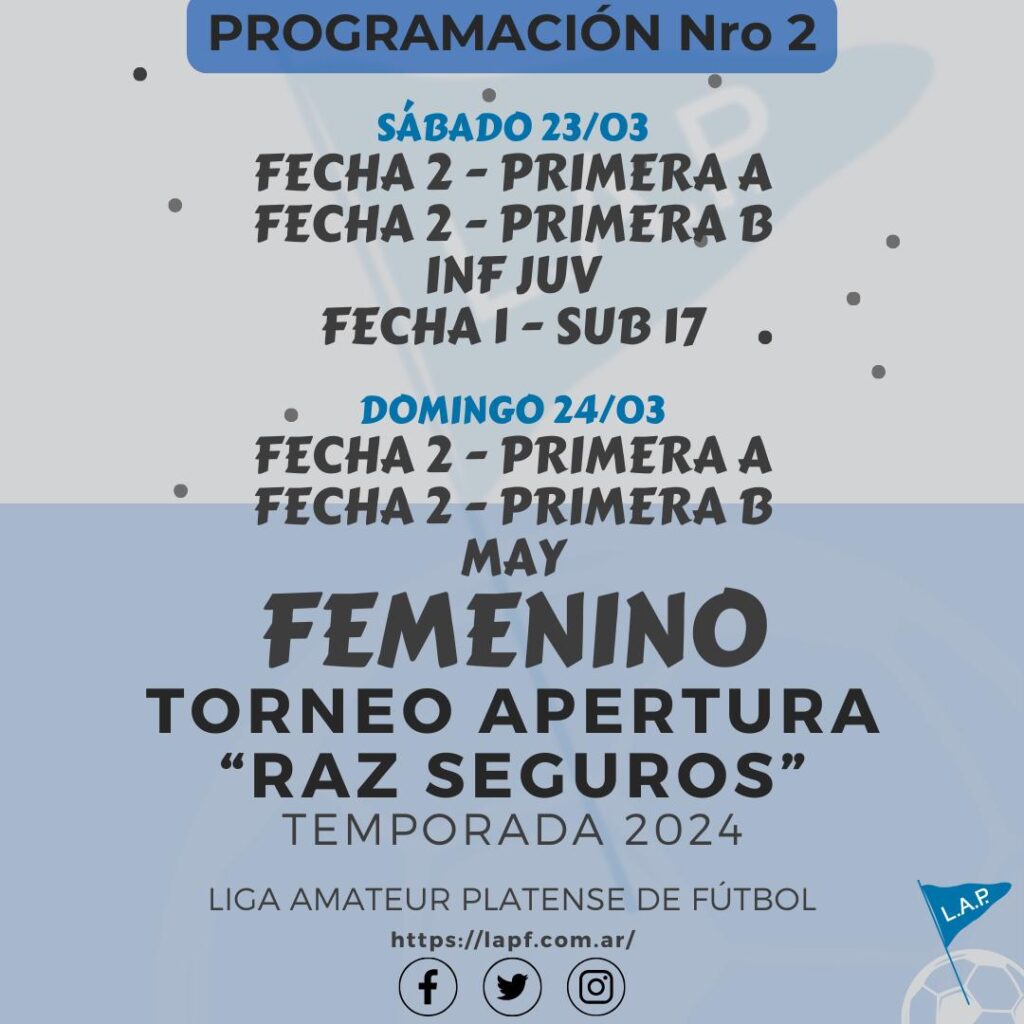 Les comunicamos el boletín informativo con la programación N°2 a disputarse el próximo fin de semana según el siguiente cronograma: