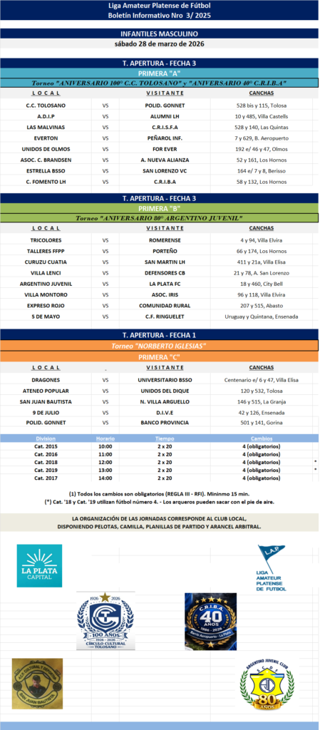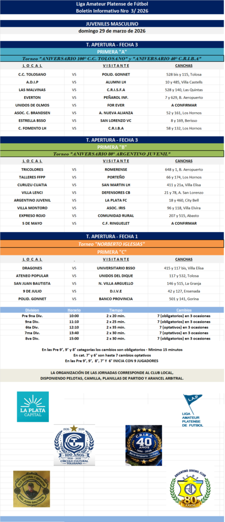 #Masculino T. APERTURA LA PLATA CAPITAL – “ANIVERSARIO 100° C.C. TOLOSANO” -“ANIVERSARIO 40° C.R.I.B.A” – “ANIVERSARIO 80° ARGENTINO JUVENIL” – “NORBERTO IGLESIAS ” | FECHA 3 PRIMERA A Y PRIMERA B – FECHA 1 PRIMERA C JUVENILES