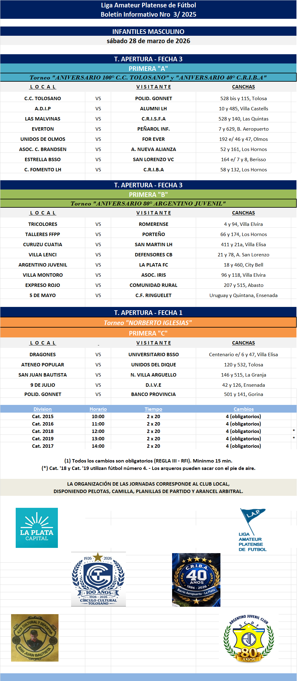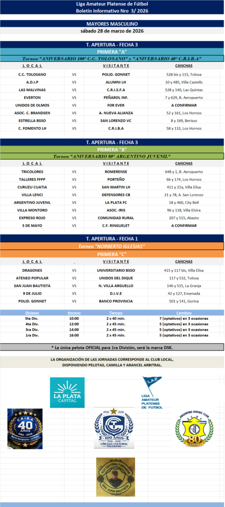 #Masculino T. APERTURA LA PLATA CAPITAL – “ANIVERSARIO 100° C.C. TOLOSANO” -“ANIVERSARIO 40° C.R.I.B.A” – “ANIVERSARIO 80° ARGENTINO JUVENIL” – “NORBERTO IGLESIAS” | FECHA 3 PRIMERA A Y PRIMERA B – FECHA 1 PRIMERA C MAYORES, SENIORS E INFANTILES