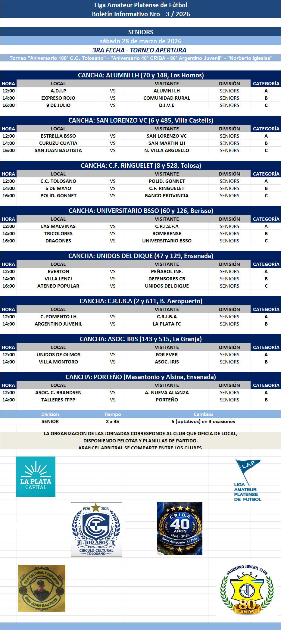 PROGRAMACIÓN NRO 3 – 2026: T. APERTURA LA PLATA CAPITAL – “ANIVERSARIO 100° C.C. TOLOSANO” -“ANIVERSARIO 40° C.R.I.B.A” – “ANIVERSARIO 80° ARGENTINO JUVENIL” – “NORBERTO IGLESIAS”