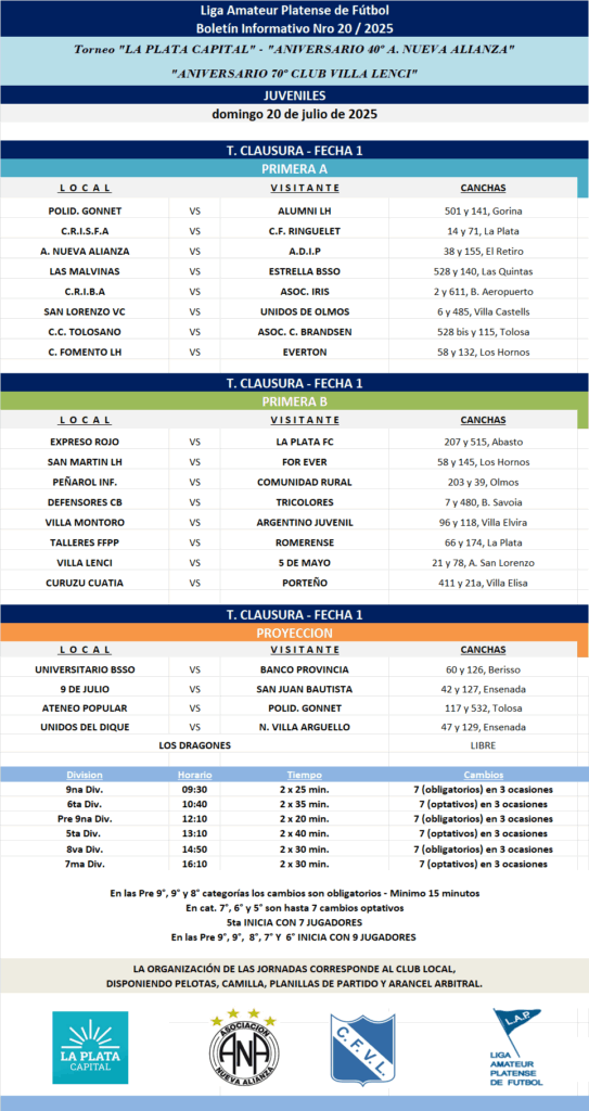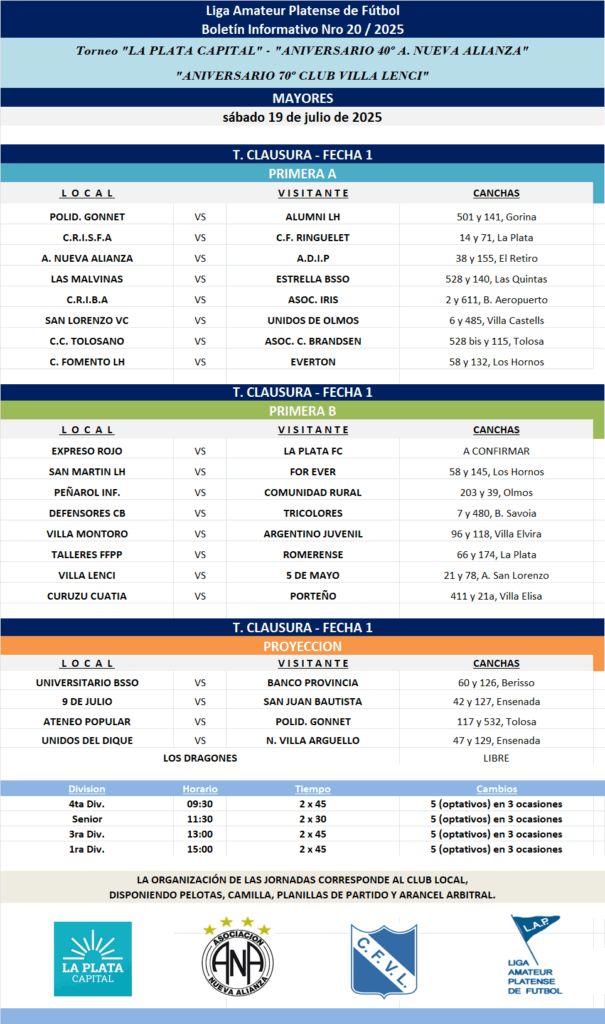 #Masculino T. APERTURA LA PLATA CAPITAL – ANIVERSARIO 40 NUEVA ALIANZA – ANIVERSARIO 70 VILLA LENCI – Primera A | Primera B | T.PROYECCIÓN FECHA 1 MAYORES E INFANTILES