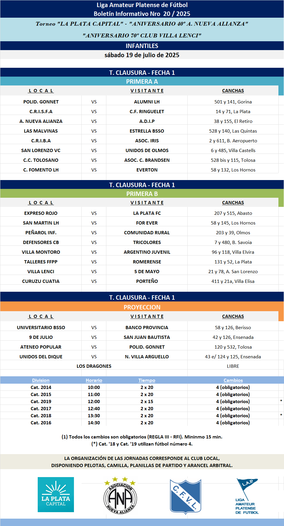 #Masculino T. APERTURA LA PLATA CAPITAL – ANIVERSARIO 40 NUEVA ALIANZA – ANIVERSARIO 70 VILLA LENCI – Primera A | Primera B | T.PROYECCIÓN FECHA 1 MAYORES E INFANTILES