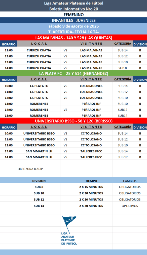 Les comunicamos el boletín informativo con la programación N°20 a disputarse el próximo fin de semana según el siguiente cronograma: