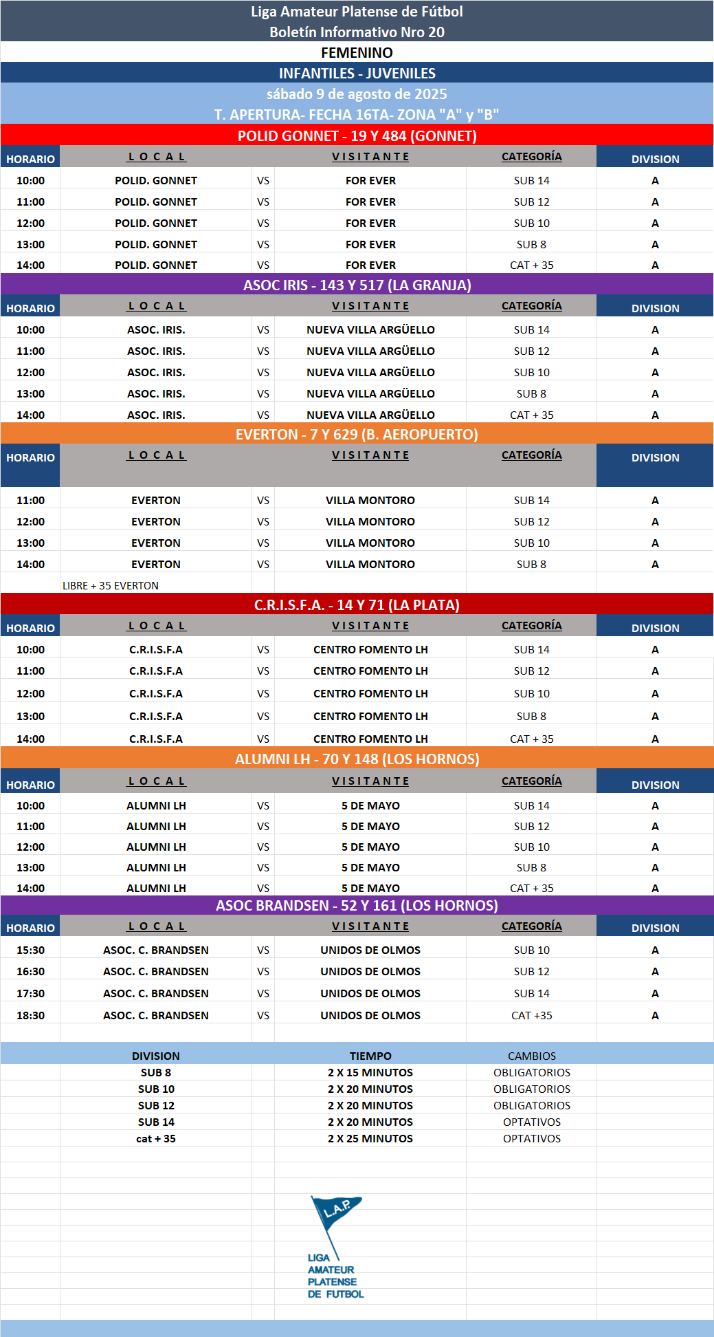 Les comunicamos el boletín informativo con la programación N°20 a disputarse el próximo fin de semana según el siguiente cronograma: