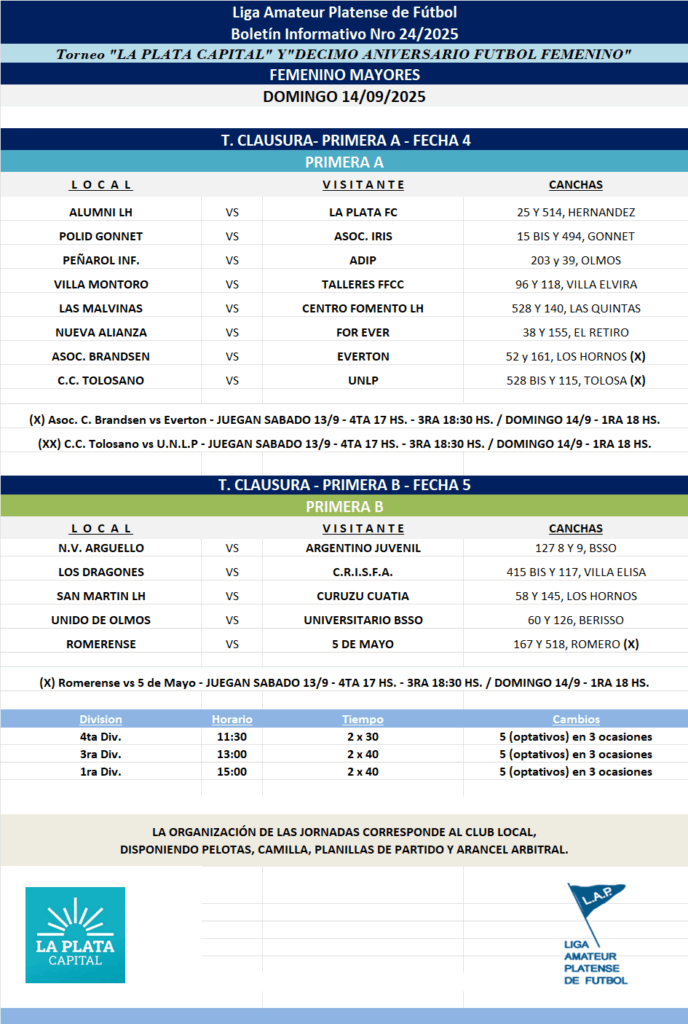 #Femenino T.CLAUSURA 2025 – Primera A Fecha 4 ┃ Primera B Fecha 5 – MAYORES