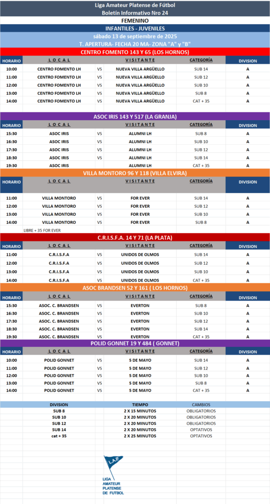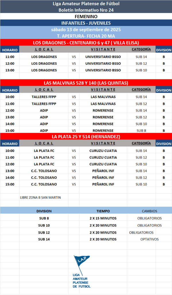 Les comunicamos el boletín informativo con la programación N°24 a disputarse el próximo fin de semana según el siguiente cronograma: