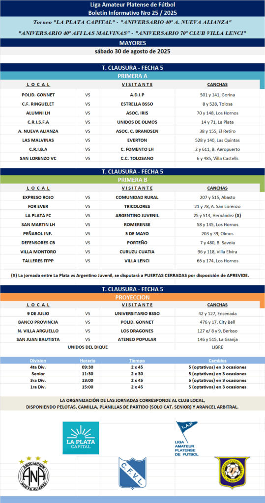 PROGRAMACIÓN NRO 25 – 2025: T. CLAUSURA LA PLATA CAPITAL – ANIVERSARIO 40 NUEVA ALIANZA – ANIVERSARIO 70 VILLA LENCI – ANIVERSARIO 40 LAS MALVINAS