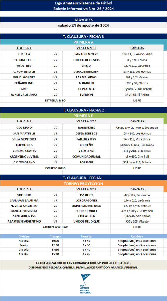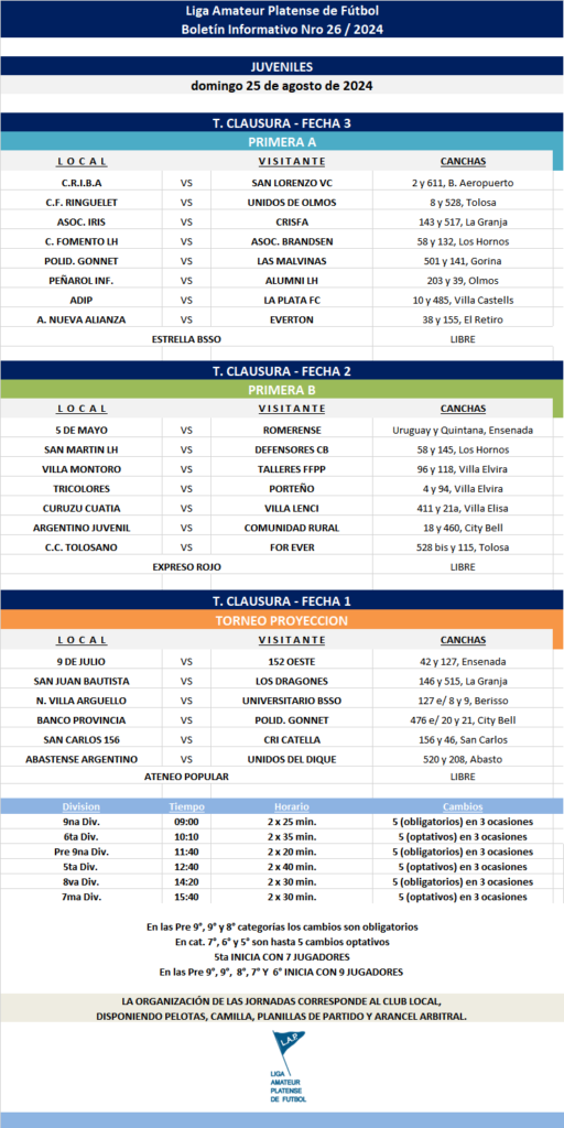 Masculino T. CLAUSURA 2024 – Primera A – FECHA 3 | PRIMERA B – FECHA 2 | T.PROYECCIÓN – FECHA 1 INFANTILES Y MAYORES