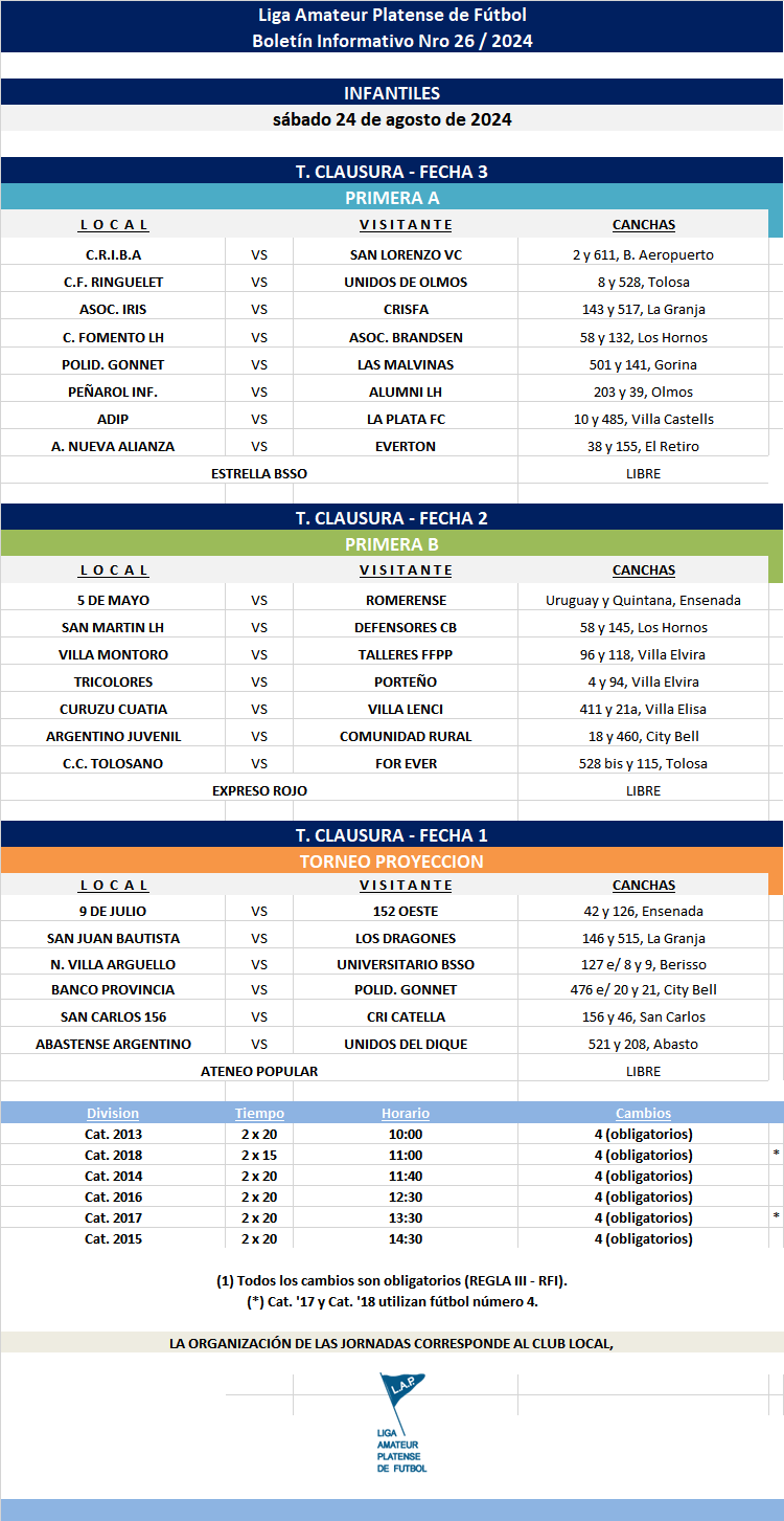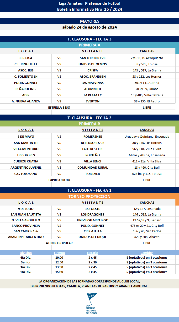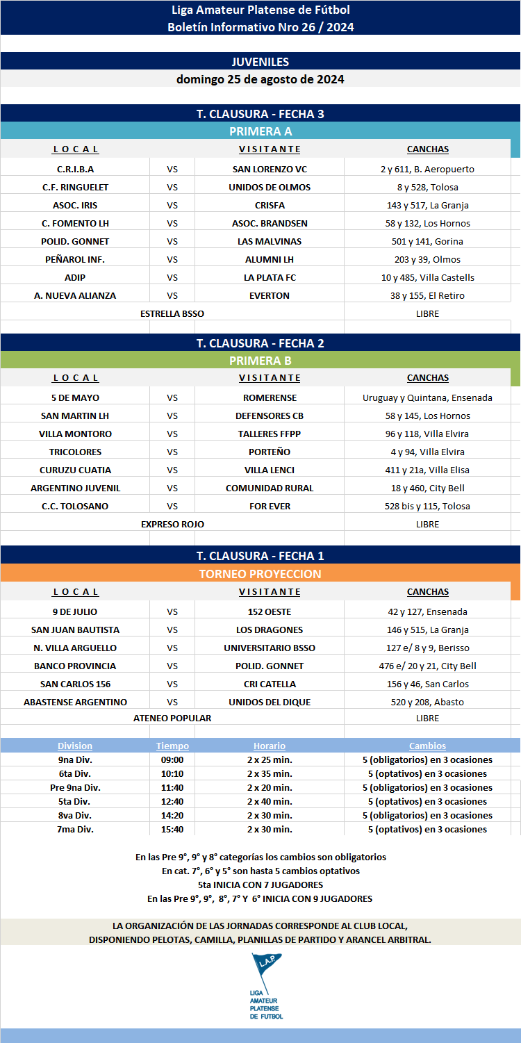 Masculino T. CLAUSURA 2024 – Primera A – FECHA 3 | PRIMERA B – FECHA 2 | T.PROYECCIÓN – FECHA 1 INFANTILES Y MAYORES