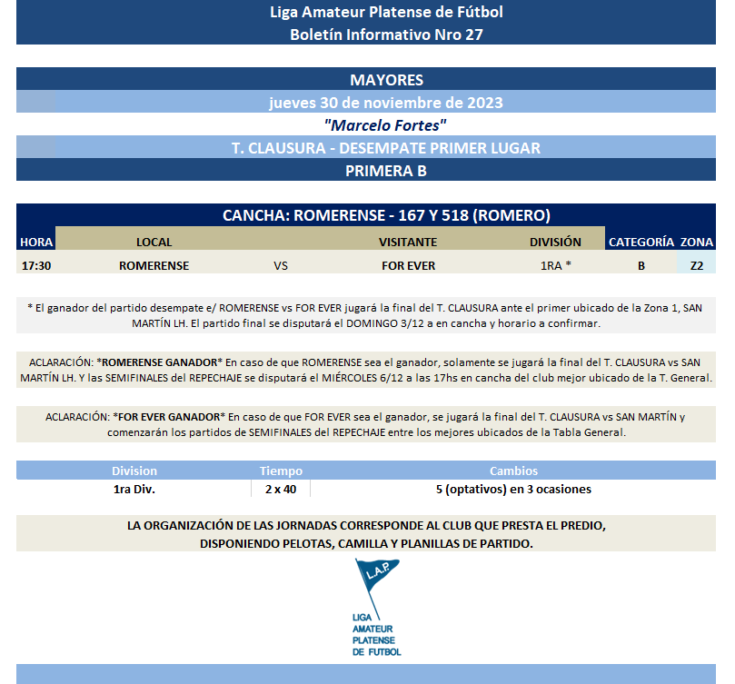 * El ganador del partido desempate e/ ROMERENSE vs FOR EVER jugará la final del T. CLAUSURA ante el primer ubicado de la Zona 1, SAN MARTÍN LH. El partido final se disputará el DOMINGO 3/12 a en cancha y horario a confirmar.