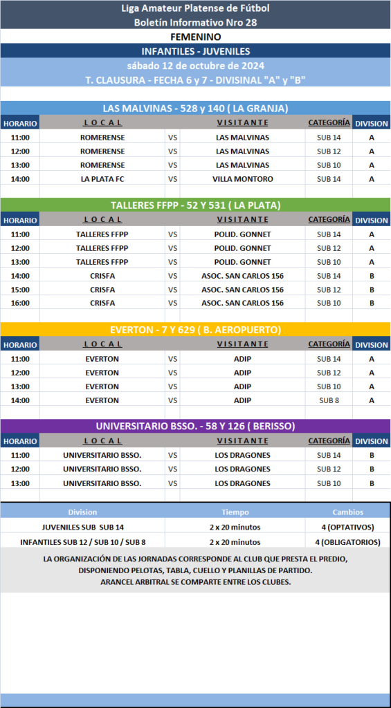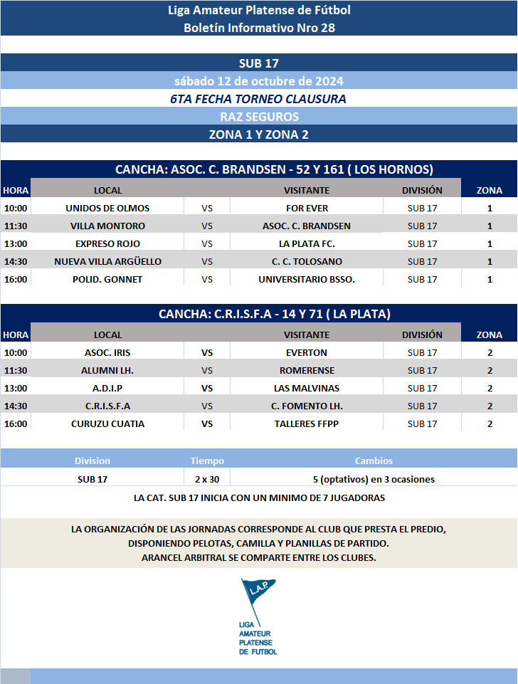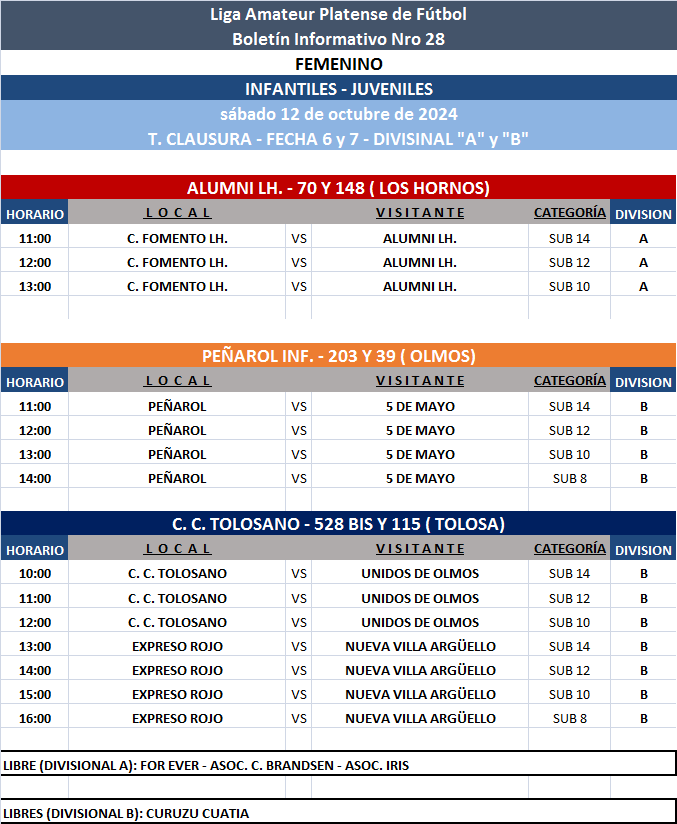Les comunicamos el boletín informativo con la programación N°28 a disputarse el próximo fin de semana según el siguiente cronograma: