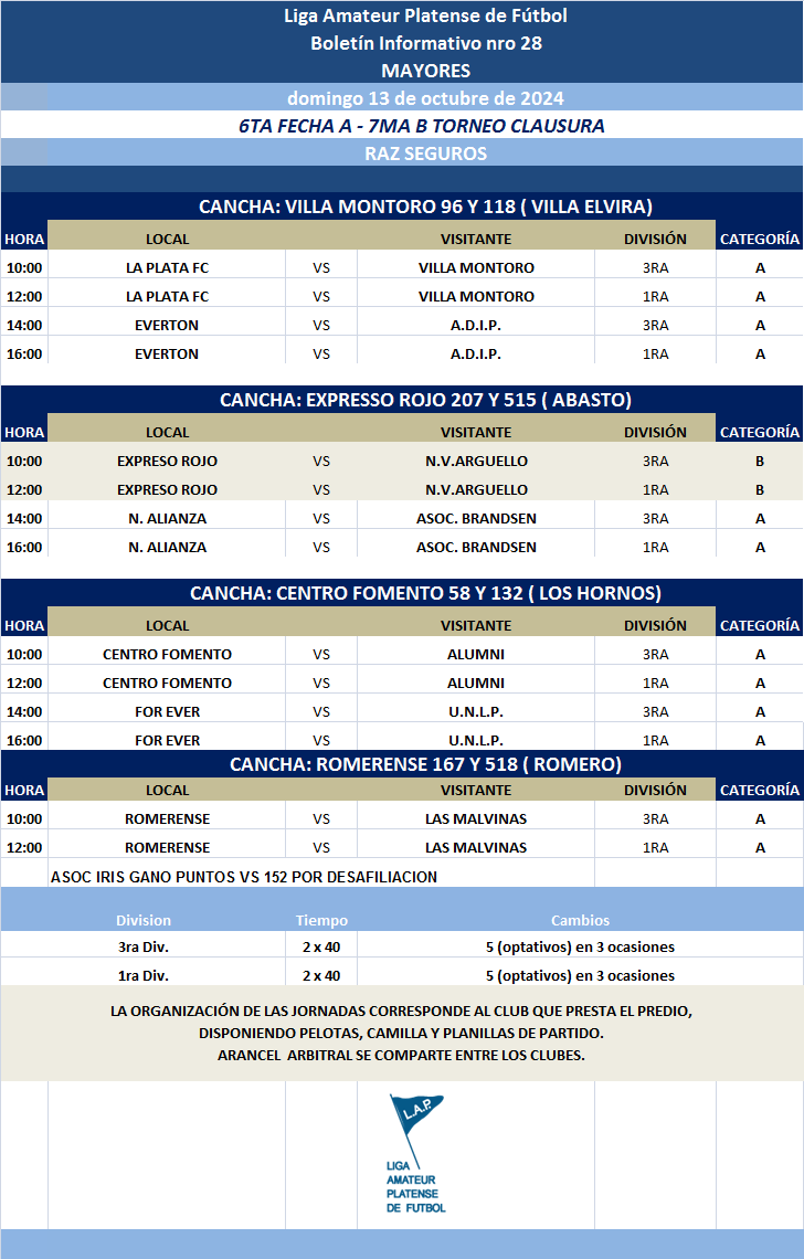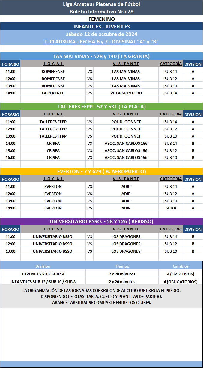 Les comunicamos el boletín informativo con la programación N°28 a disputarse el próximo fin de semana según el siguiente cronograma: