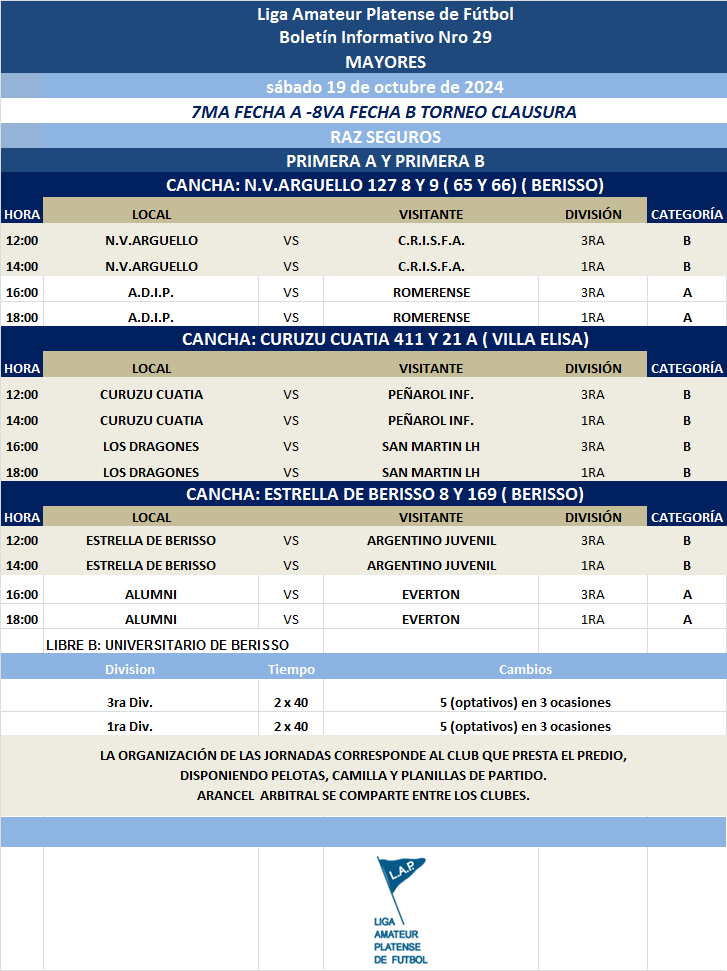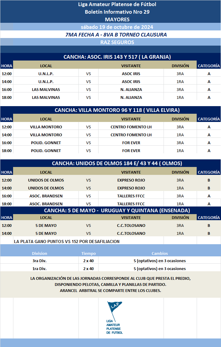 Les comunicamos el boletín informativo con la programación N°29 a disputarse el próximo fin de semana según el siguiente cronograma: