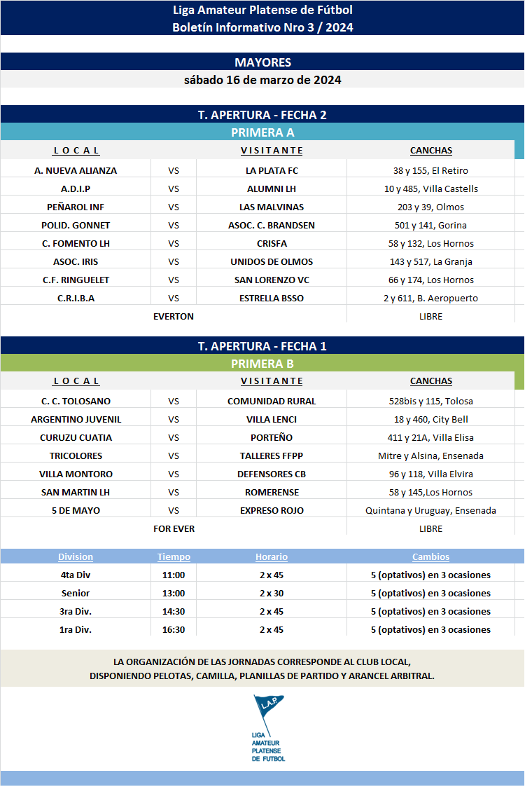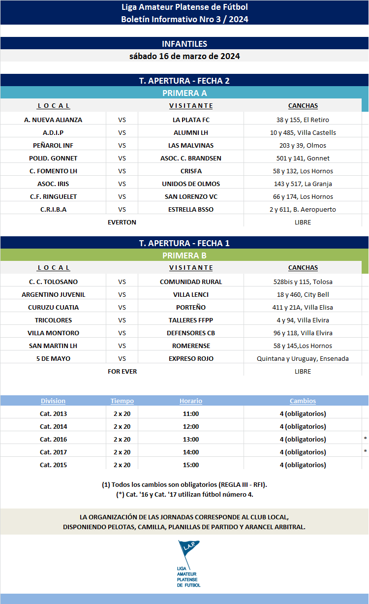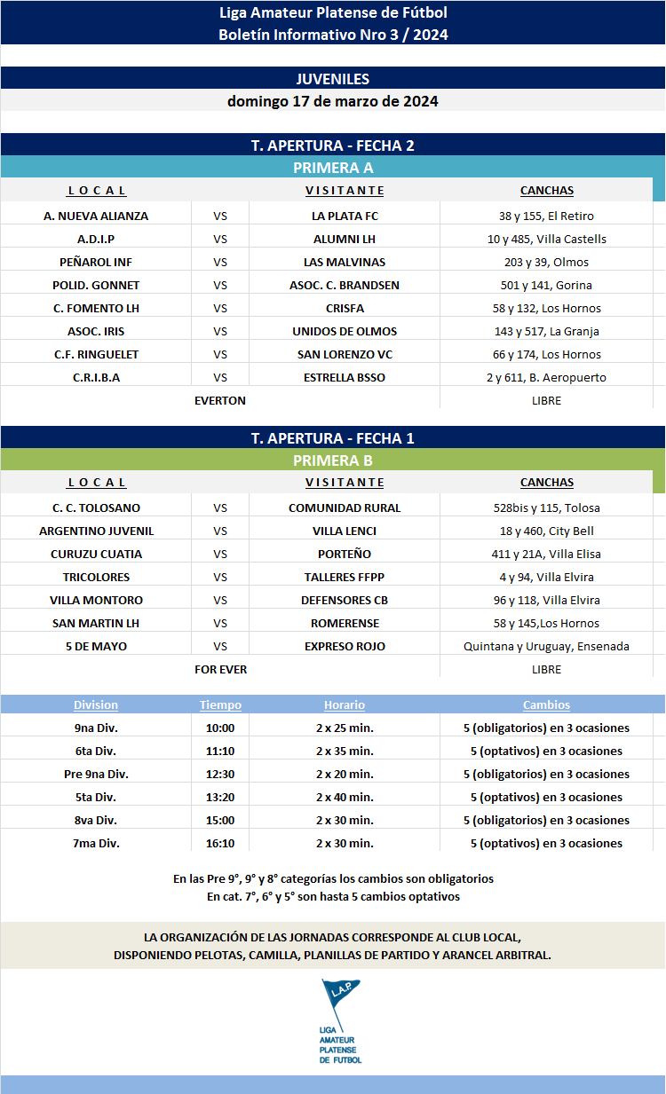 Les compartimos el boletín informativo con la programación Nro°3 a disputarse el próximo fin de semana según el siguiente cronograma: