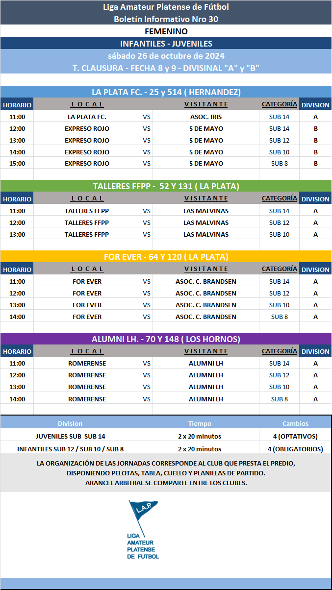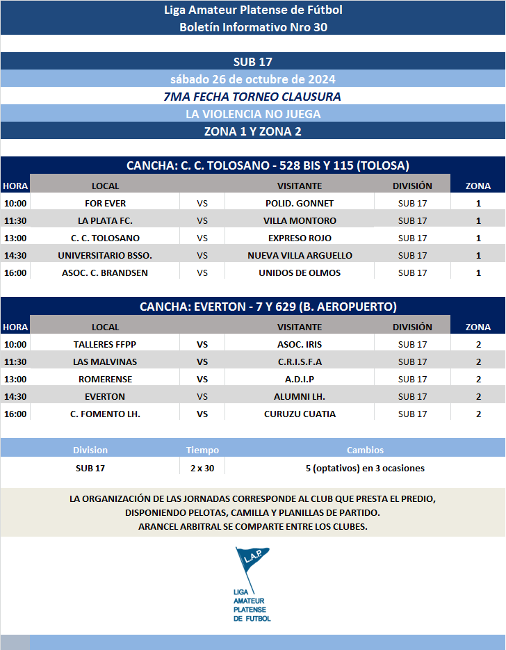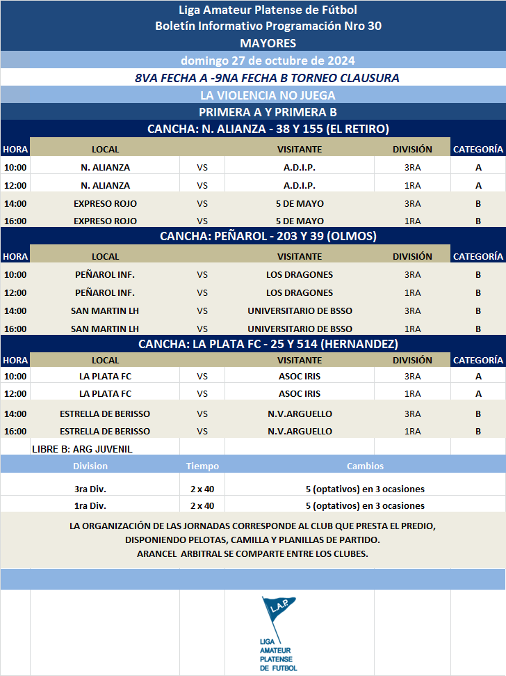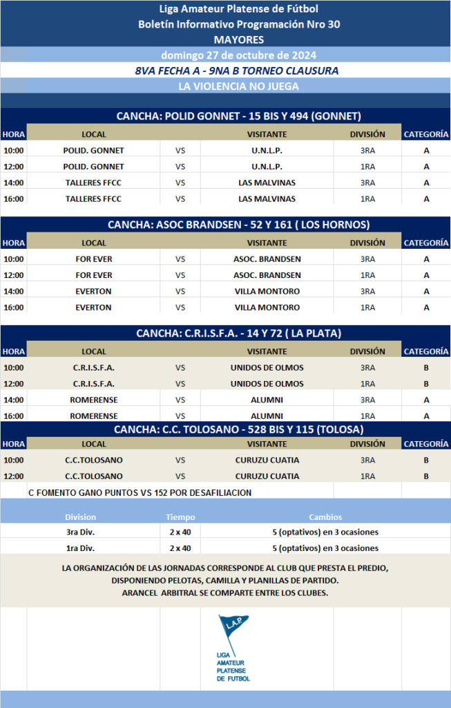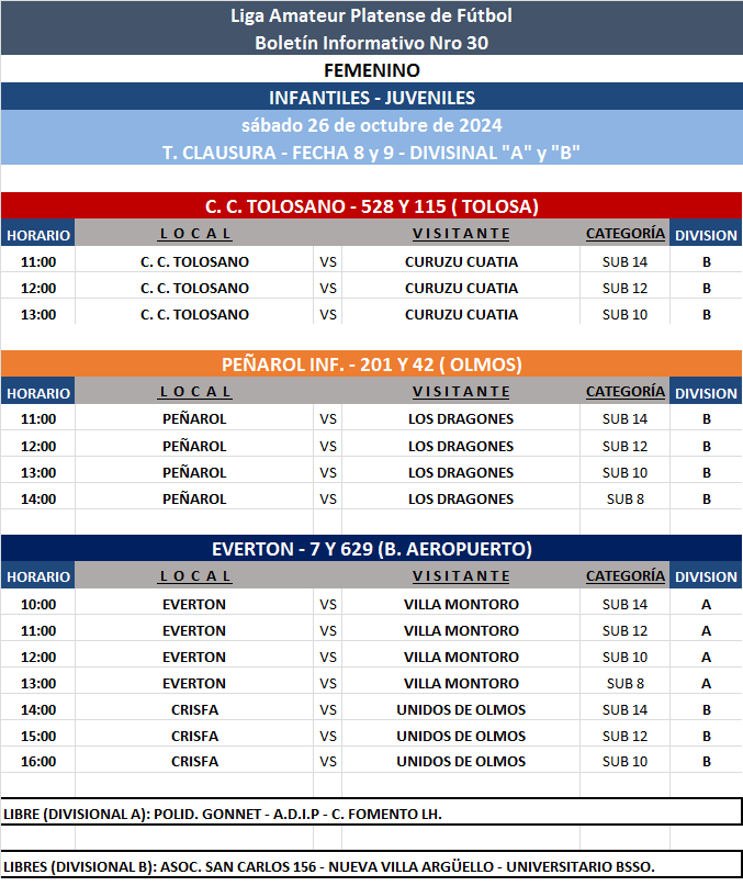 Les comunicamos el boletín informativo con la programación N°30 a disputarse el próximo fin de semana según el siguiente cronograma: