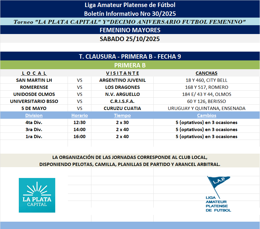 #Femenino T.CLAUSURA 2025 –- Primera B Fecha 9 – MAYORES