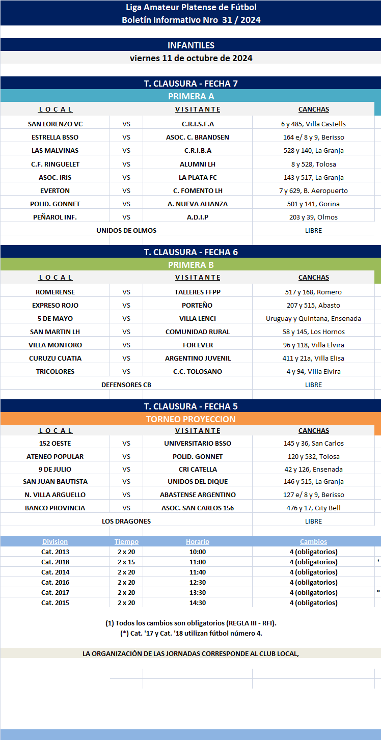 Masculino T. CLAUSURA 2024 – Primera A – FECHA 7 | PRIMERA B – FECHA 6 | T.PROYECCIÓN – FECHA 5 INFANTILES Y JUVENILES