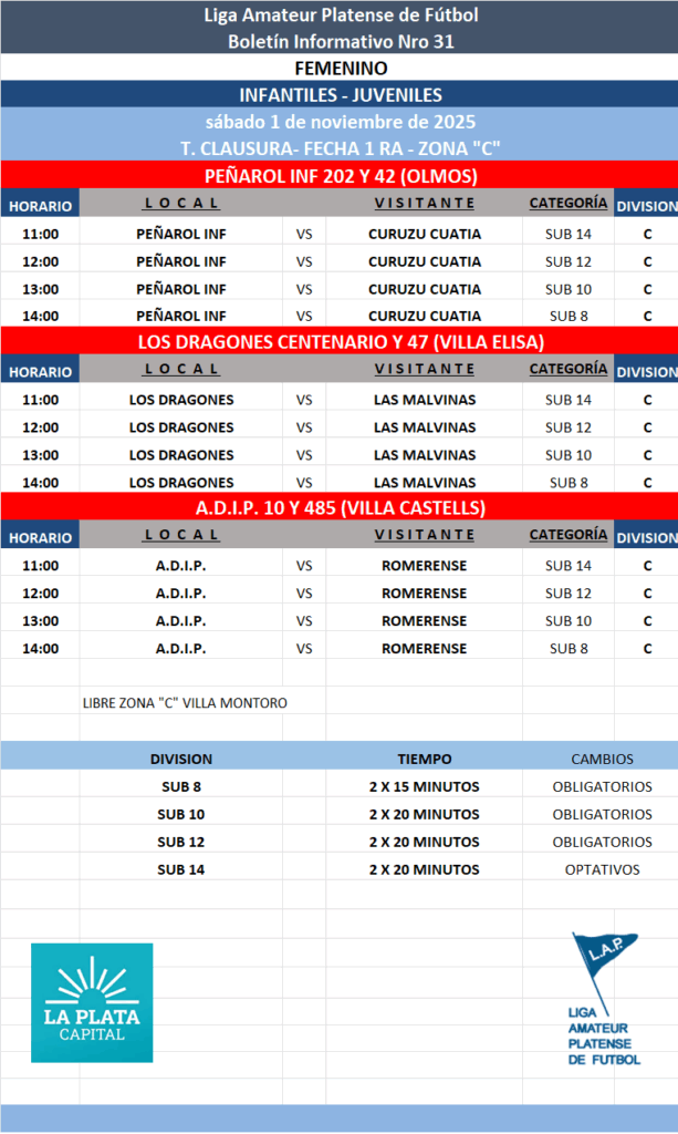 Les comunicamos el boletín informativo con la programación N°31 a disputarse el próximo fin de semana según el siguiente cronograma: