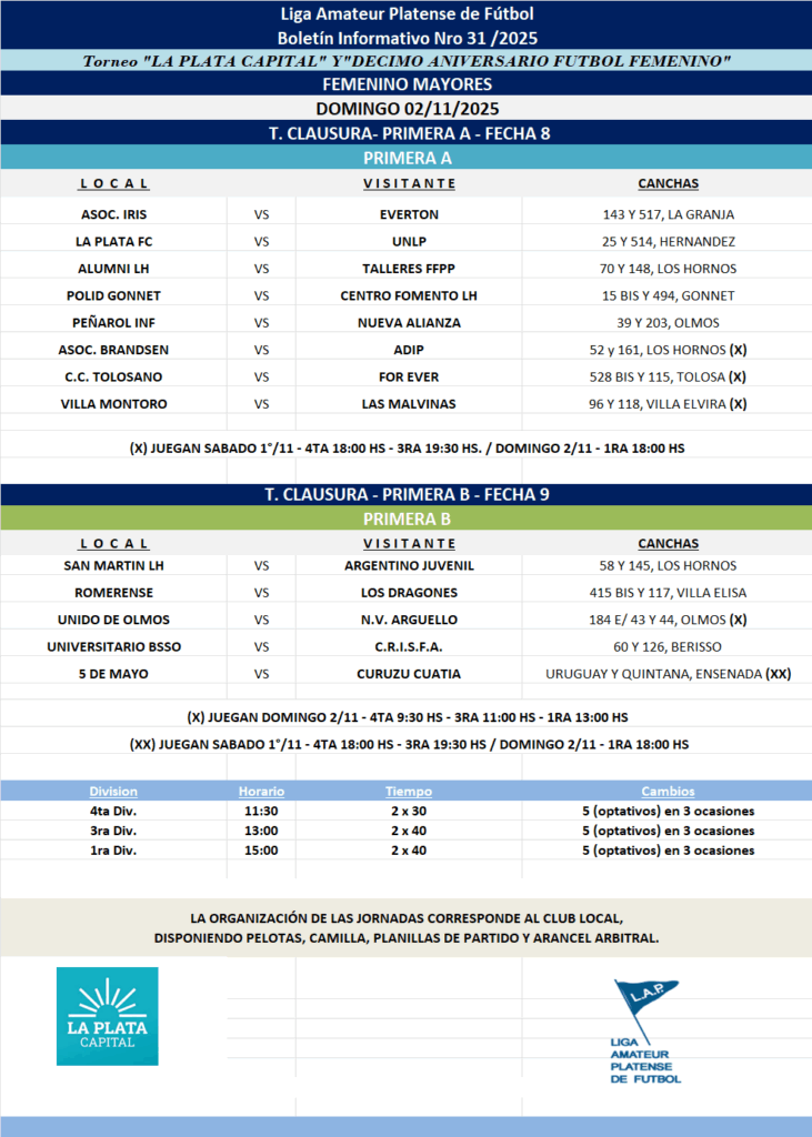 #Femenino T.CLAUSURA 2025 –- Primera A – Fecha 8 | Primera B Fecha 9 – MAYORES