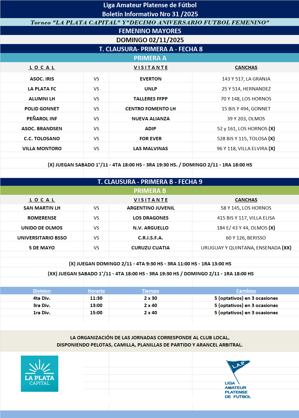#Femenino T.CLAUSURA 2025 –- Primera A – Fecha 8 | Primera B Fecha 9 – MAYORES