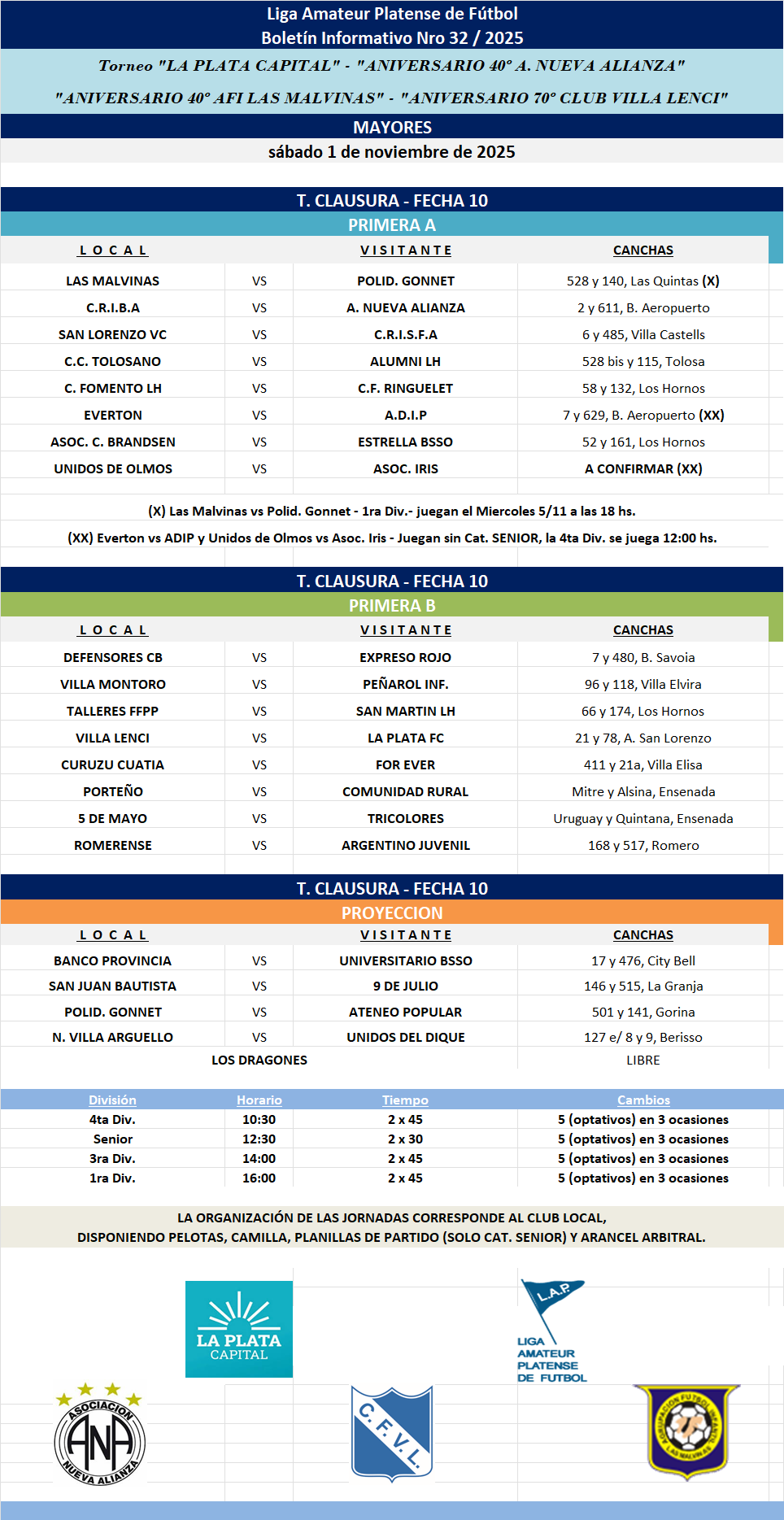 PROGRAMACIÓN NRO 32 – 2025: T. CLAUSURA LA PLATA CAPITAL – ANIVERSARIO 40 NUEVA ALIANZA – ANIVERSARIO 70 VILLA LENCI – ANIVERSARIO 40 LAS MALVINAS