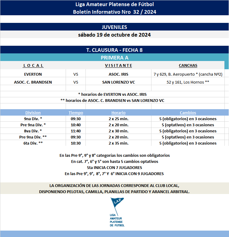 Masculino T. CLAUSURA 2024 – Primera A – FECHA 8 | PRIMERA B – FECHA 7 | T.PROYECCIÓN – FECHA 6 INFANTILES, MAYORES Y *JUVENILES REPROGRAMADAS DE EVERTON – ASOC. IRIS Y ASOC.C.BRANDSEN – SAN LORENZO VC.