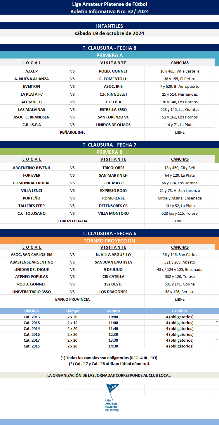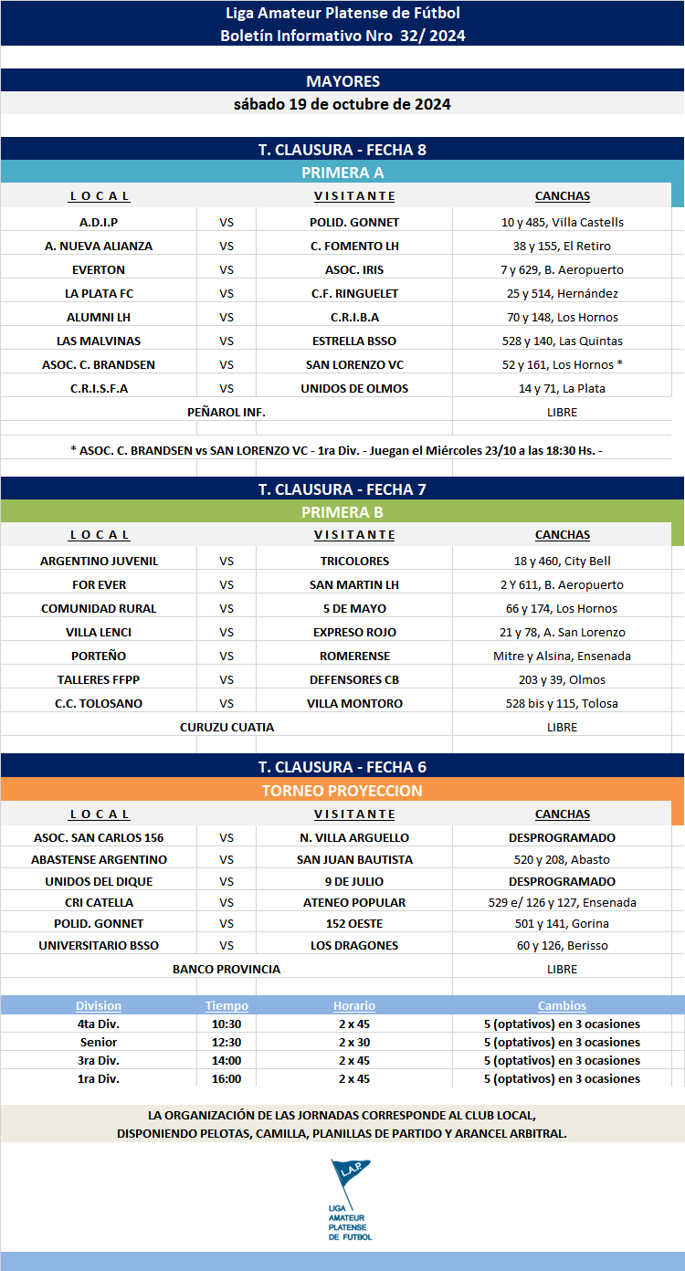 Masculino T. CLAUSURA 2024 – Primera A – FECHA 8 | PRIMERA B – FECHA 7 | T.PROYECCIÓN – FECHA 6 INFANTILES, MAYORES Y *JUVENILES REPROGRAMADAS DE EVERTON – ASOC. IRIS Y ASOC.C.BRANDSEN – SAN LORENZO VC.