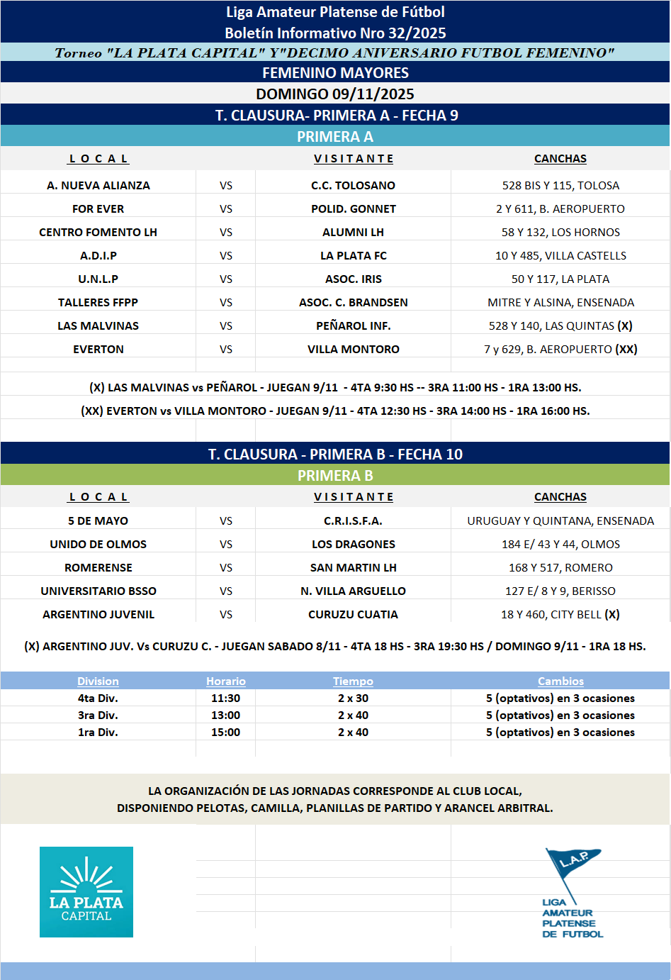#Femenino T.CLAUSURA 2025 –- Primera A – Fecha 9 | Primera B Fecha 10 – MAYORES