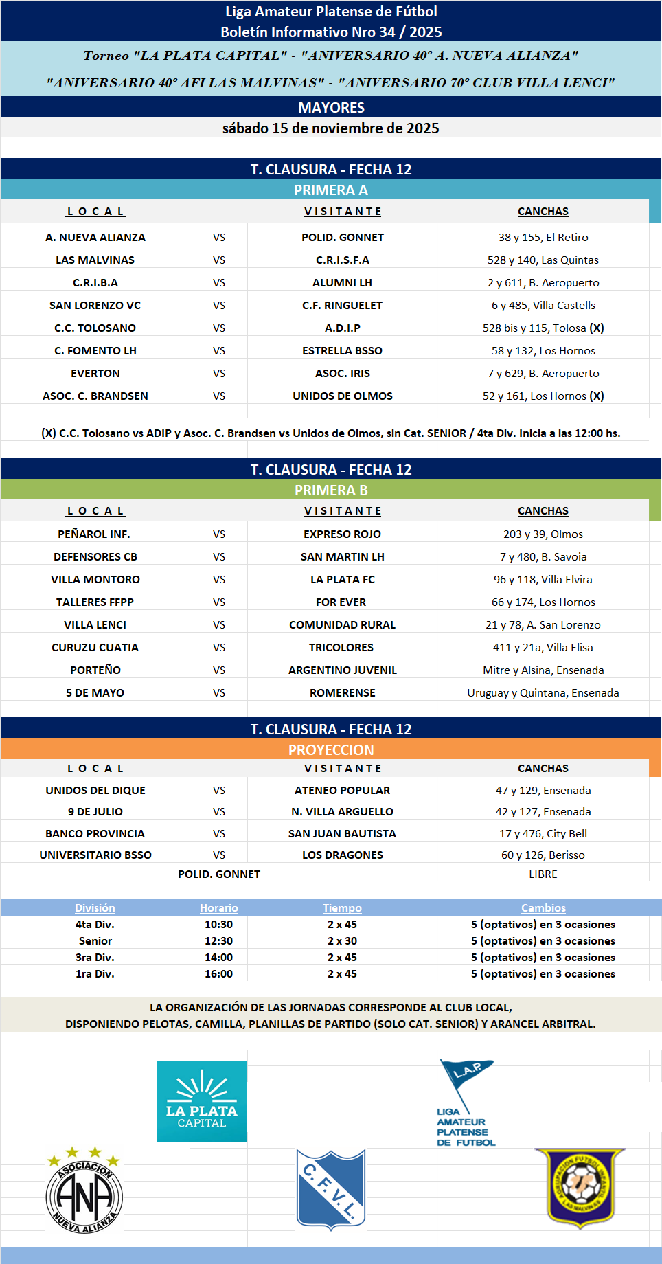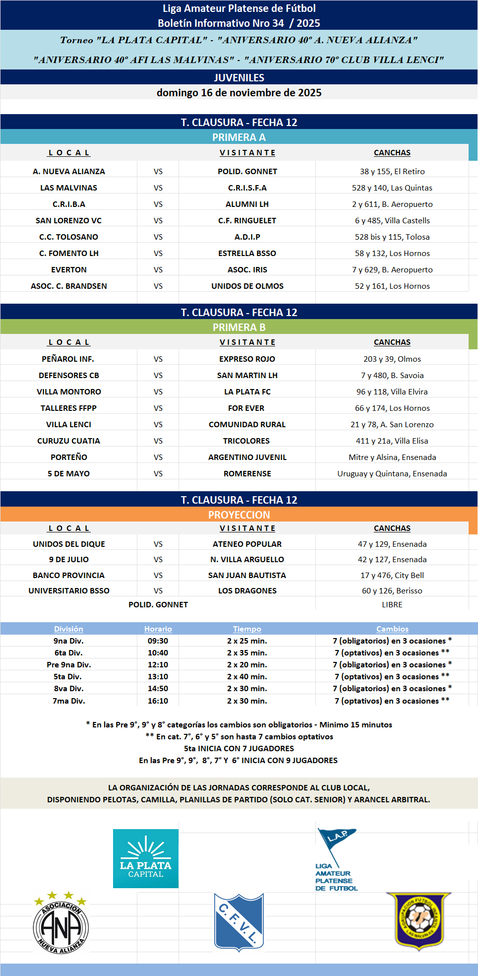 #Masculino T. CLAUSURA LA PLATA CAPITAL – ANIVERSARIO 40 NUEVA ALIANZA – ANIVERSARIO 70 VILLA LENCI – ANIVERSARIO 40 LAS MALVINAS – Primera A | Primera B | T.PROYECCIÓN FECHA 12 JUVENILES
