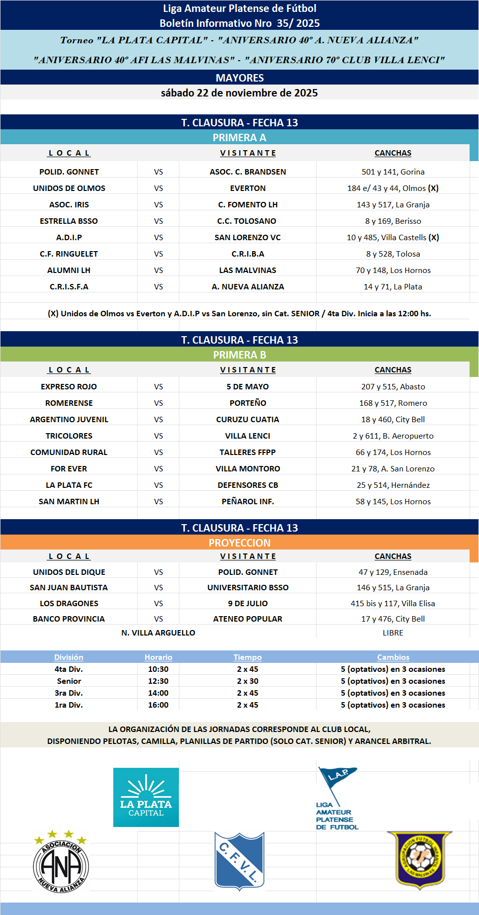 PROGRAMACIÓN NRO 35 – 2025: T. CLAUSURA LA PLATA CAPITAL – ANIVERSARIO 40 NUEVA ALIANZA – ANIVERSARIO 70 VILLA LENCI – ANIVERSARIO 40 LAS MALVINAS