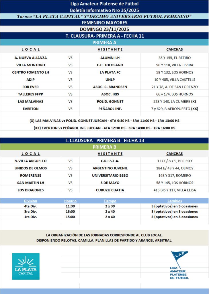 #Femenino T.CLAUSURA 2025 –- Primera A – Fecha 11 | Primera B Fecha 13 – MAYORES