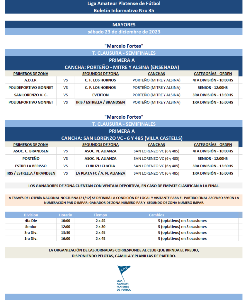 PROGRAMACIÓN NRO 35: PRIMERA A – T. CLAUSURA – SEMIFINALES MAYORES #Masculino