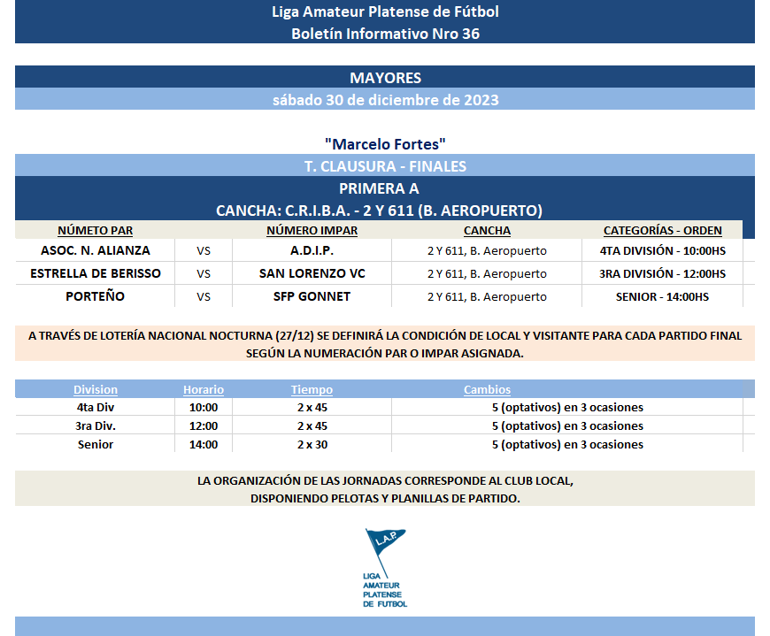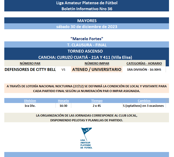 * LA FINAL DE 1RA DIVISIÓN CORRESPONDIENTE AL T. CLAUSURA DEL TORNEO ASCENSO SE DISPUTARÁ EL SÁBADO 30/12 A LAS 16:30HS ENTRE LOS CLUBES DEFENSORES DE CITY BELL Y QUIEN RESULTE DE LA RESOLUCIÓN DEL H. TRIBUNAL DE DISCIPLINA.