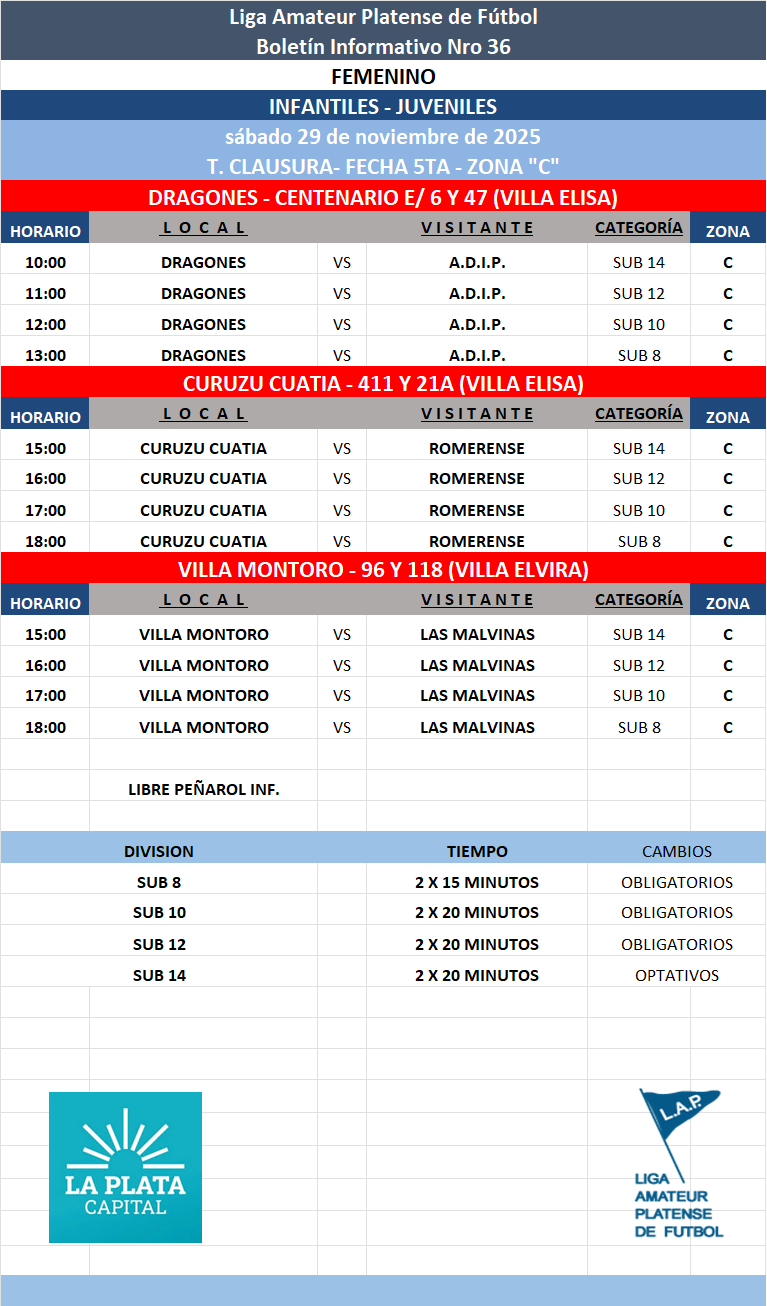 Les comunicamos el boletín informativo con la programación N°36 a disputarse el próximo fin de semana según el siguiente cronograma: